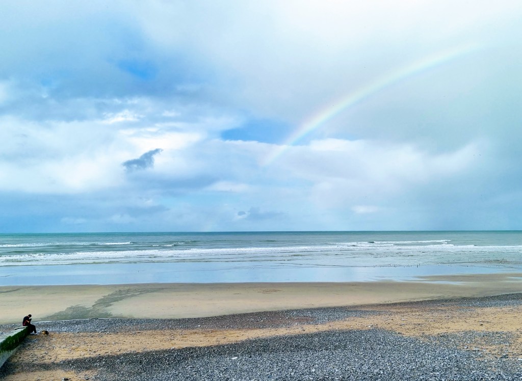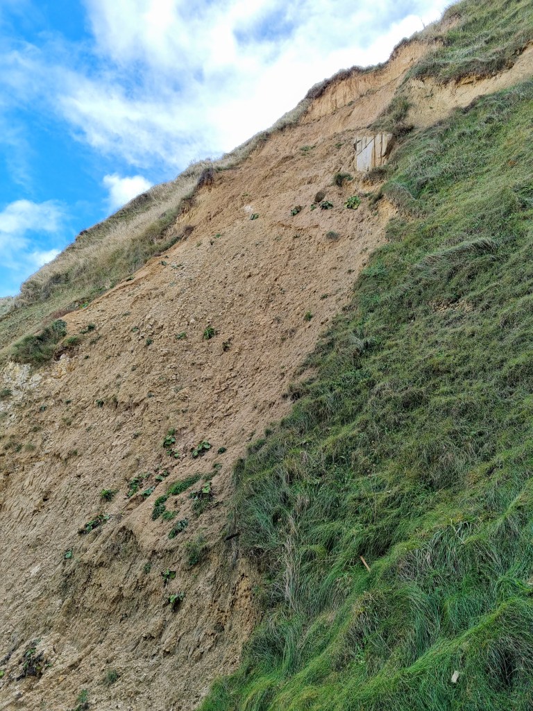 Depuis le cimetière, la vue va jusqu’où nos yeux peuvent aller : le ciel et la mer changent sans cesse : doré puis gris ; verte puis grise. Les prés sont luisants et la falaise mélange la craie et les coulées de boue ocre, imposant l’image de la destruction à venir. Des falaises blanches paraitraient hors du temps. Ici, les traces noires annoncent la catastrophe climatique qui approche. D’ailleurs, je viens de lire dans les informations d’Ouest France que l’église repose sur un sol de plus en plus instable et glisse lentement vers l’abîme. La falaise haute de 80 mètres est attaquée par l’érosion. Un jour tout sera englouti !