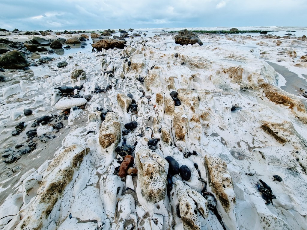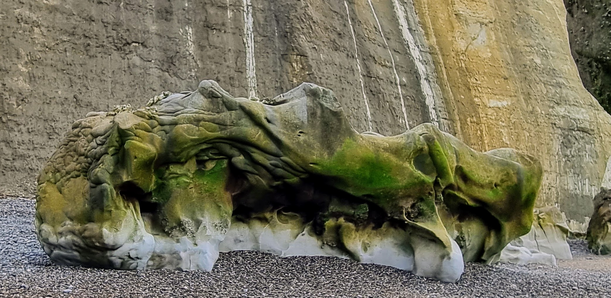 En bas, on découvre une plage de galets, jonchée de rochers sombres couverts de verdure. Un paysage d’une beauté extraordinaire.