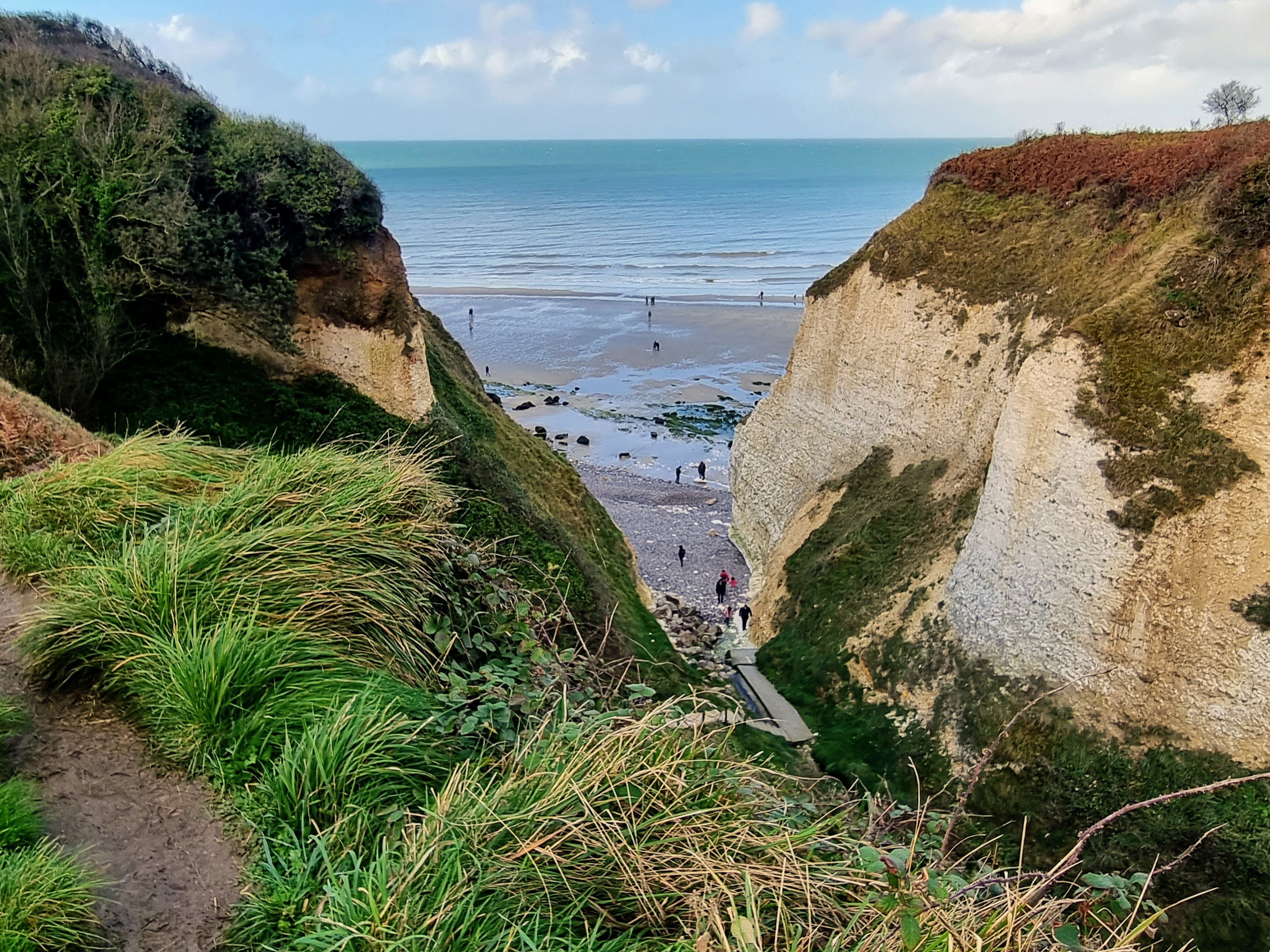 Les valleuses sont des vallons perchés, suspendus au-dessus du niveau actuel de la mer. Celle-ci s’appelle, je crois, Gorge des Moutiers, si escarpée, malgré les aménagements, qu’on peut hésiter devant le gouffre béant en-dessous.