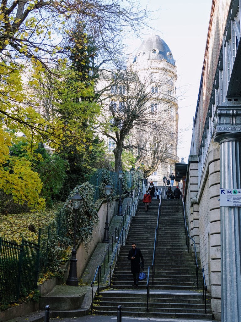 Au bas de la rue, à gauche, un escalier très raide, caché entre les piles du métro et les arbres du square, rejoint la station Passy, située à mi pente.