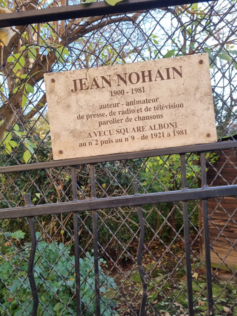 A droite du métro, un escalator facilite la montée. Quelqu’un a fait apposer une plaque en l’honneur de Jean Nohain sur la grille de cette partie droite du jardin, mais qui connaît encore l’animateur Jean Nohain ? La survie qu’offre la plaque n’est qu’une demi-survie, à l’usage de flâneurs déjà âgés.
