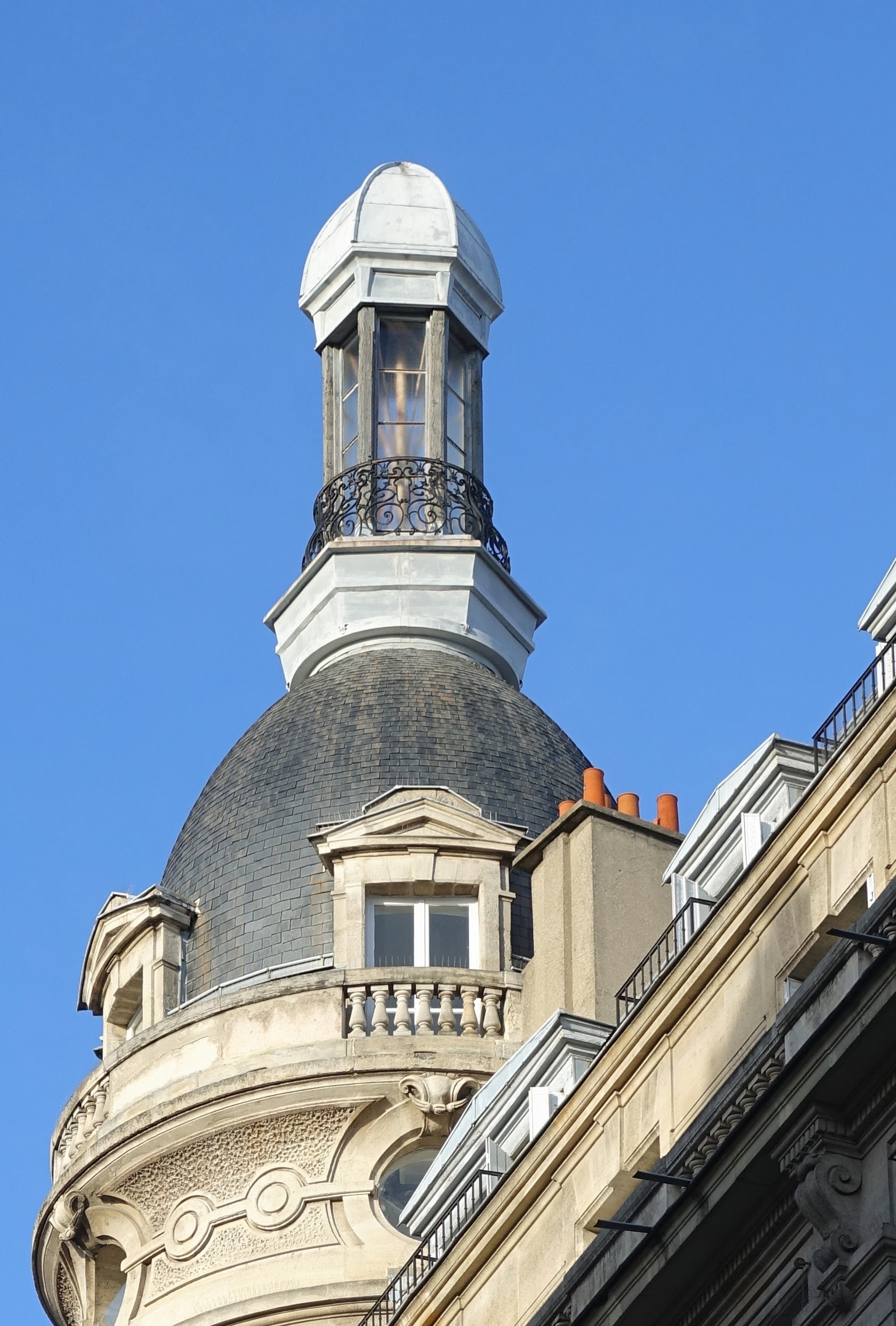 Le lotissement a été confié à l’architecte Louis Dauvergne qui a signé 8 des 9 immeubles du lotissement. Le numéro 10 est le plus extravagant par sa hauteur et par le luxe de son décor, une colonnade que surmonte une rotonde, elle-même coiffée d’un dôme et terminée par une lanterne. J’aime beaucoup cette lanterne « inutile », témoignage d’un moment où les architectes pouvaient perdre de la place (donc de l’argent) pour satisfaire les goûts de commanditaires qui embourgeoisaient les dômes et les coupoles jadis réservés aux églises.