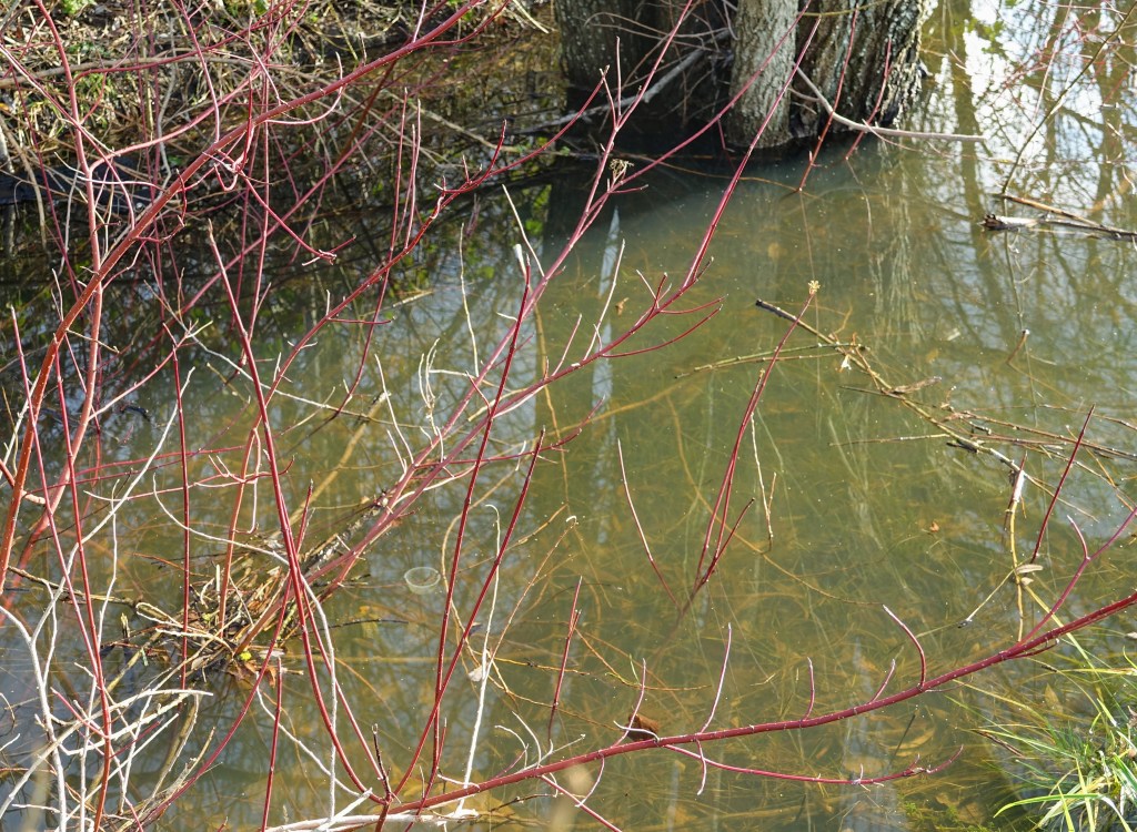 Débute ensuite une zone argileuse avec deux petites mares. Dans la première, les iris d’eau pointent déjà. Les eaux prisonnières seront peut-être asséchées l’été car je n’ai pas vu le ruisseau qui vient les alimenter, mais la végétation pousse irrésistiblement qui veut vivre, recommencer :