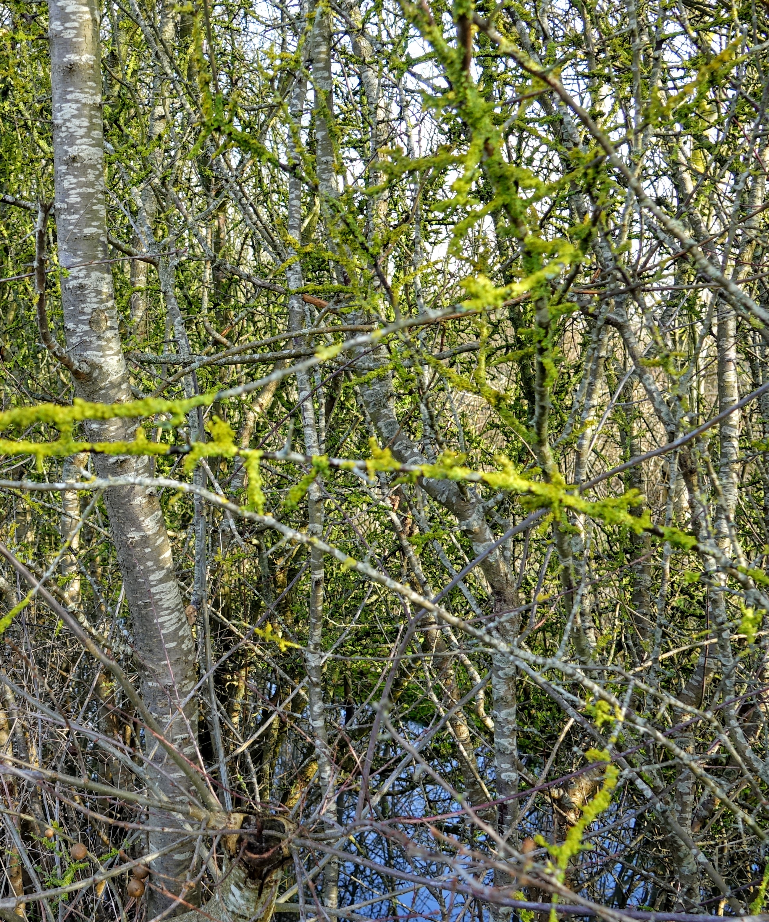 De loin en loin, le sous-bois couvert de feuilles sèches abrite de petits coussins de mousse d’un vert lumineux qui ont colonisé la moindre anfractuosité. Je ressens cette présence double : des arbres réduits à leur structure de bois décoloré et la mousse qui projette sa couleur intense sous la lumière. Je ressens cette juxtaposition comme quelque chose de troublant sans pouvoir aller plus loin que poser des couples d’opposés : la taille majestueuse des arbres et la beauté de miniature des mousses, le dessin et la couleur, la vie et la mort.