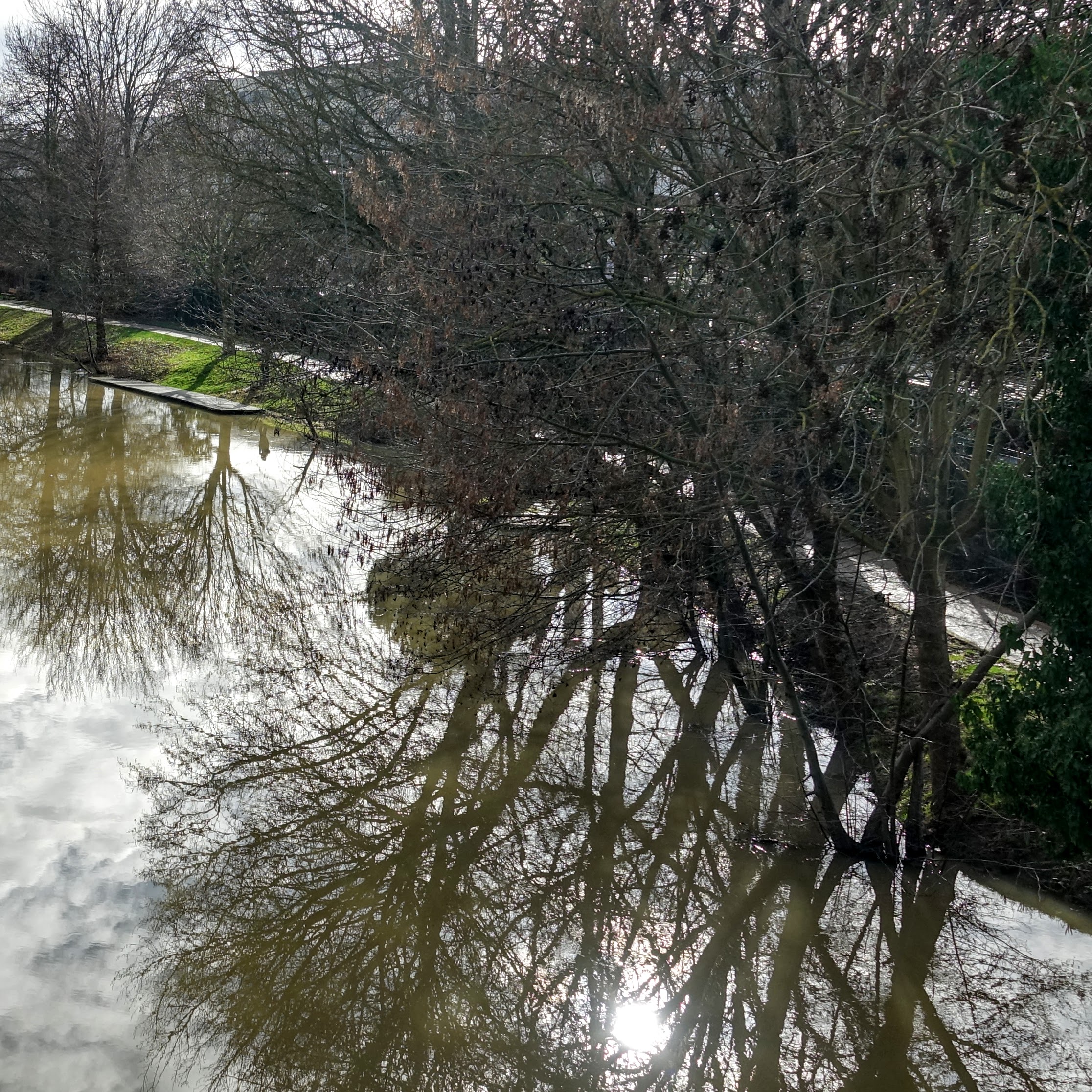 Bien sûr, il y a une file de maisons des deux côtés de l’eau, mais elles sont enchâssées dans les arbres, d’énormes platanes, des châtaigniers, encore nus en février, mais qui doivent former une ombre dense en été. Du côté de la levée de terre, on voit des maisons bourgeoises,