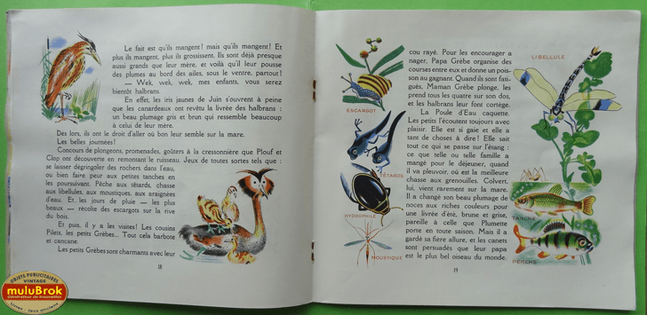 Mais pourquoi donc étais-je si contente à l’idée de voir des grèbes huppés ? Pas seulement pour les aigrettes élégantes, les plumes rousses et le bec allongé, pas seulement parce que les petits montent sur le dos des adultes et partent ainsi en promenade, mais parce qu’entendant parler des grèbes de Créteil, j’avais l’impression d’avoir rendez-vous avec un souvenir archaïque. Ce souvenir ancien m’est revenu soudain. Le nom grèbe se détache sur le fond des lectures d’enfance à présent presque oubliées. Parmi les albums du Père Castor si bien illustrés par Rojan, j’ai lu les aventures de Plouf, Le Canard Sauvage qui vivait sur un étang, entouré d’oiseaux amicaux dont les petits Grèbes en habits rayés. C’est un étrange plaisir de retrouver les premières évocations de petits fragments de réalité arrachés au passé.