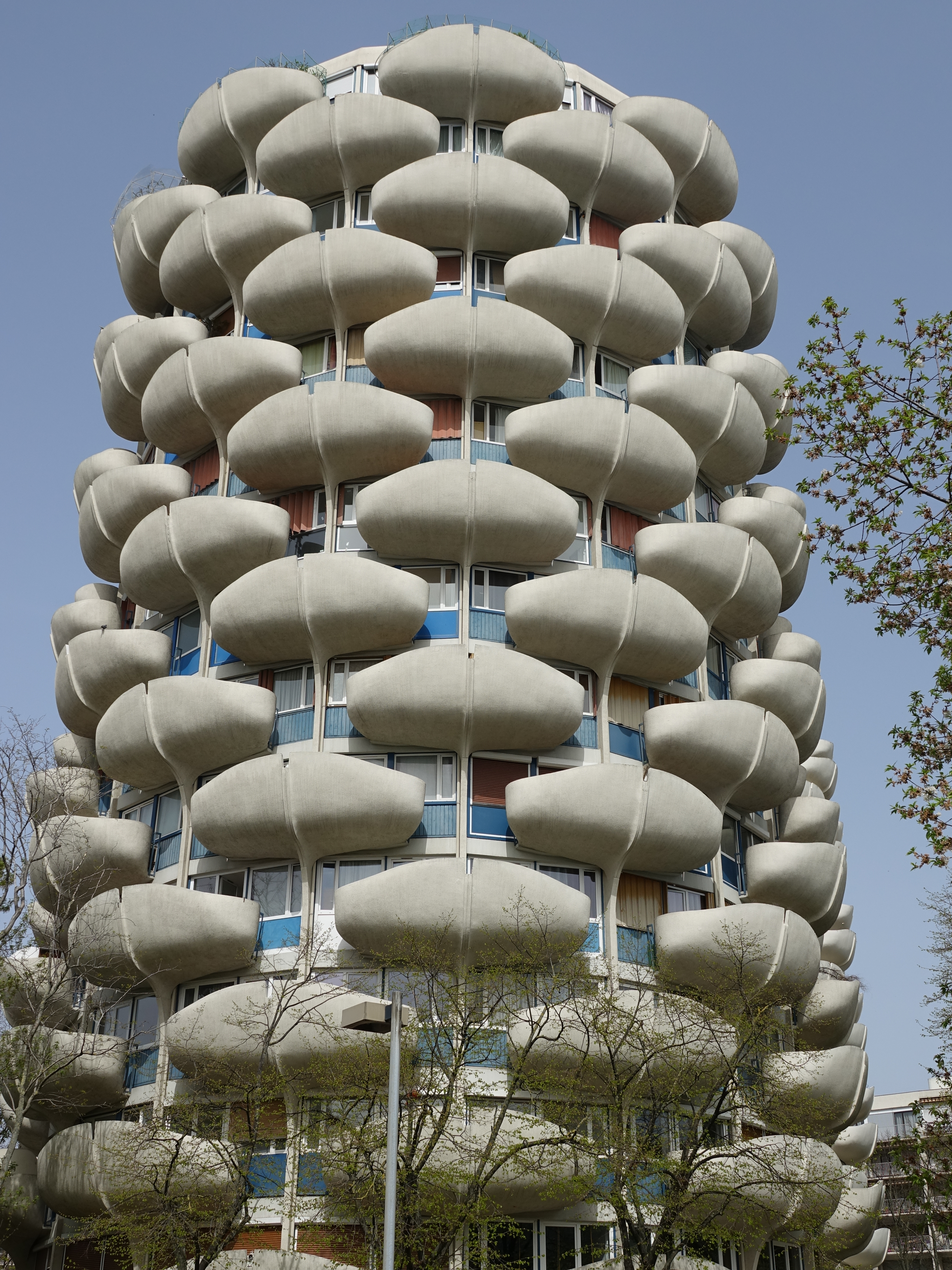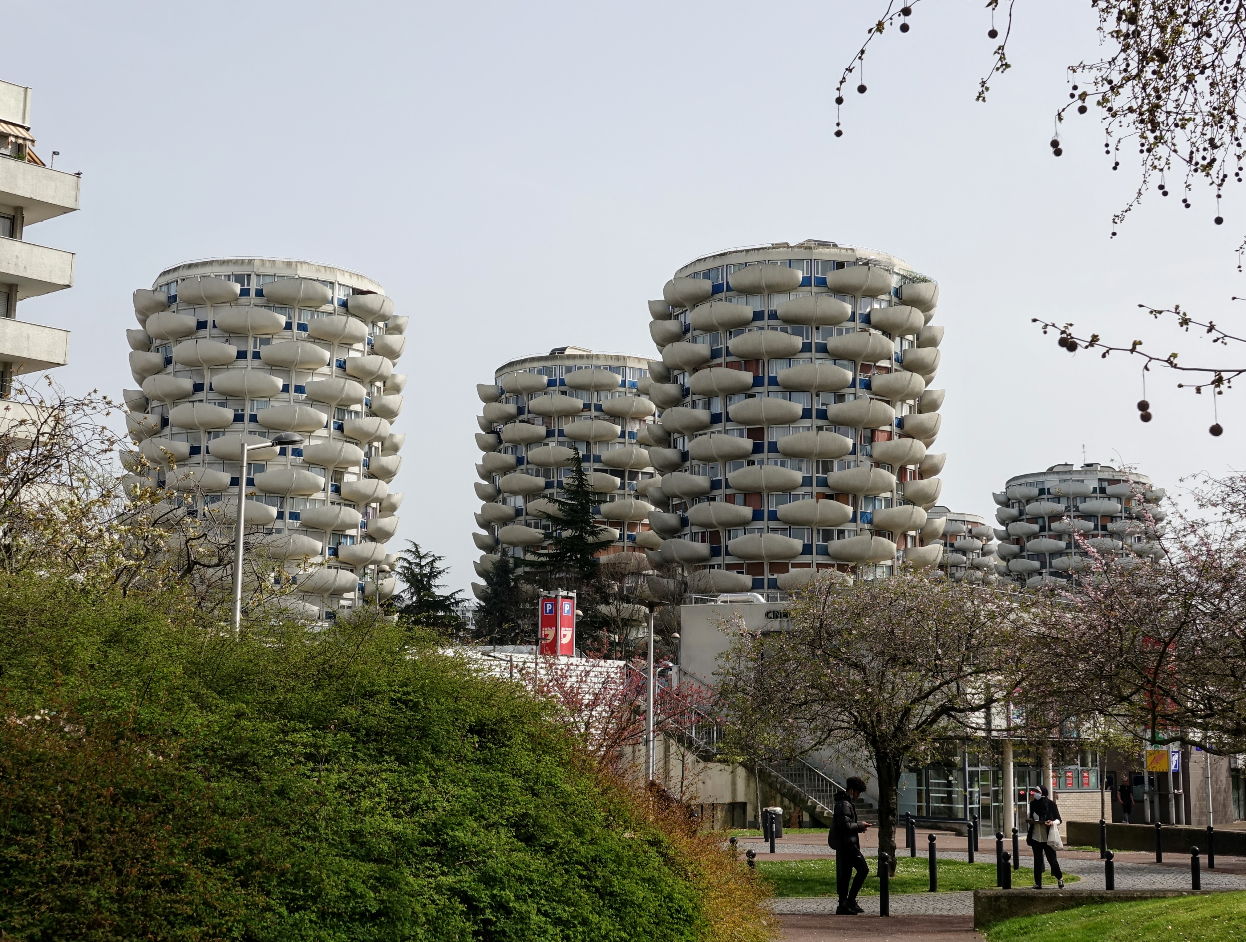 Juste à côté, commence le quartier des Choux, dessiné par Gérard Grandval. Chaque tour est hérissée de balcons évoquant vaguement des pétales repliés, ou des coquilles, qui dérobent l’intérieur au regard, ce qui devait, selon l’architecte, protéger l’intimité des occupants.