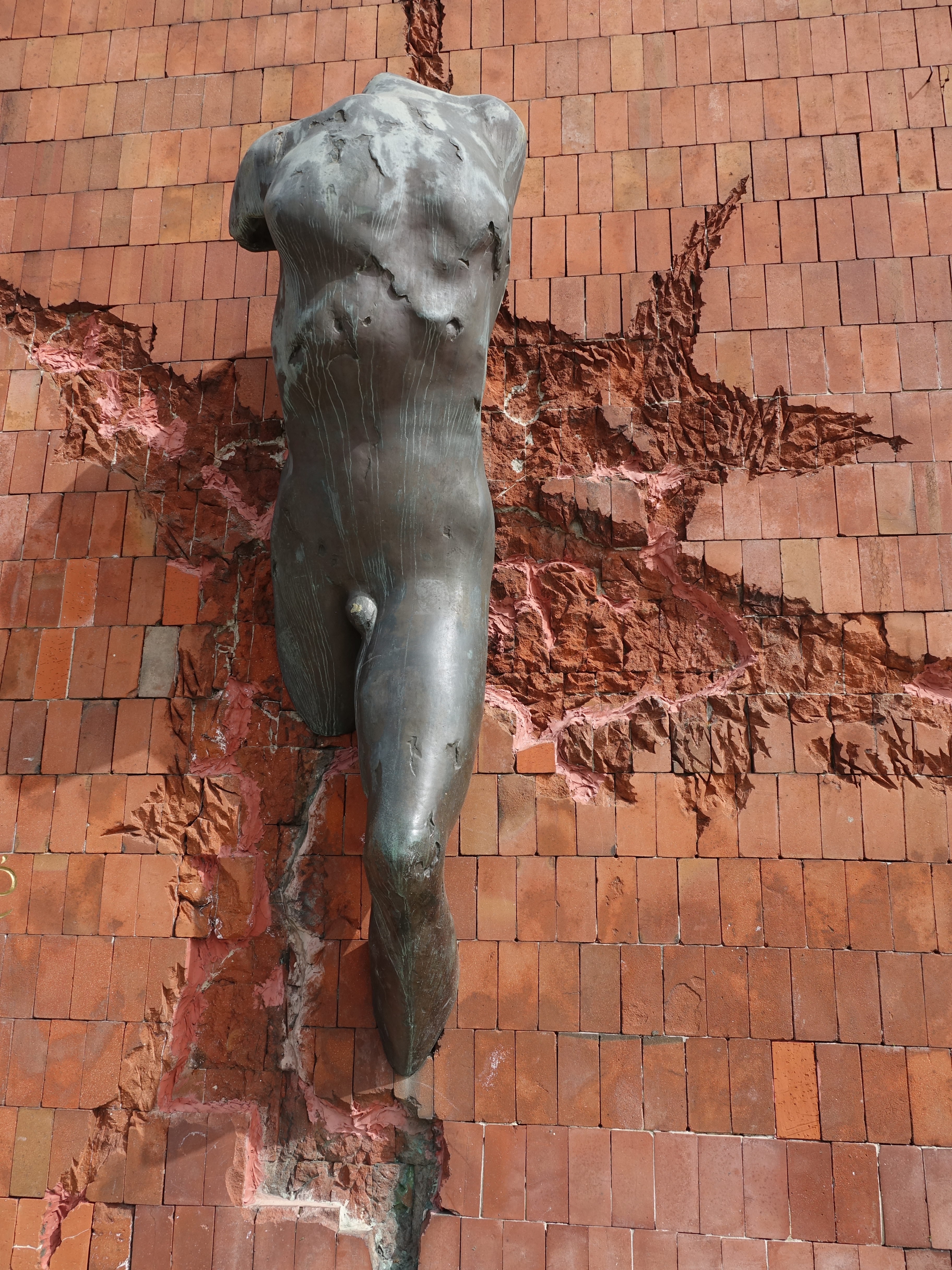 Sur l’esplanade, une sculpture de Jean Cadot dont j’ignorais tout, évidemment très symbolique : un homme de bronze fend le mur de briques qui l’emprisonnait :