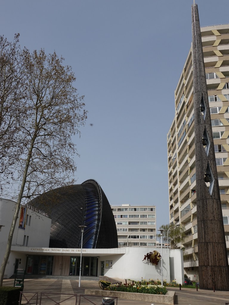 Le diocèse de Créteil est malheureusement fermé en raison du Covid, mais les deux coques de bois qui évoquent la coque d’un bateau retourné me plaisent bien. De face, l’église est arrondie, basse, si on excepte le clocher séparé en forme de mât. Longtemps, les cathédrales ont écrasé les quartiers qui les entouraient. Ici, les proportions de la tour Mansart et de l’église sont inversées. L’œuvre conçue initialement par Charles-Gustave Stoskopf était encore plus modeste.