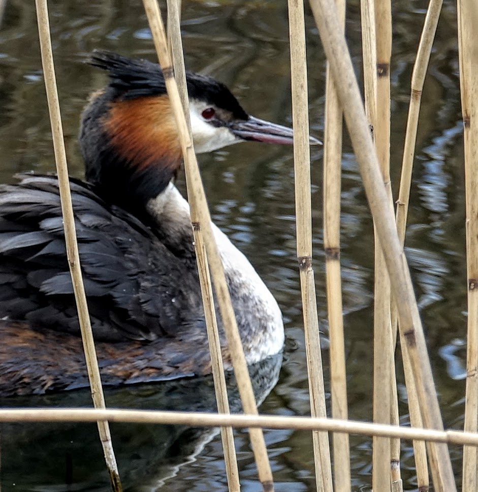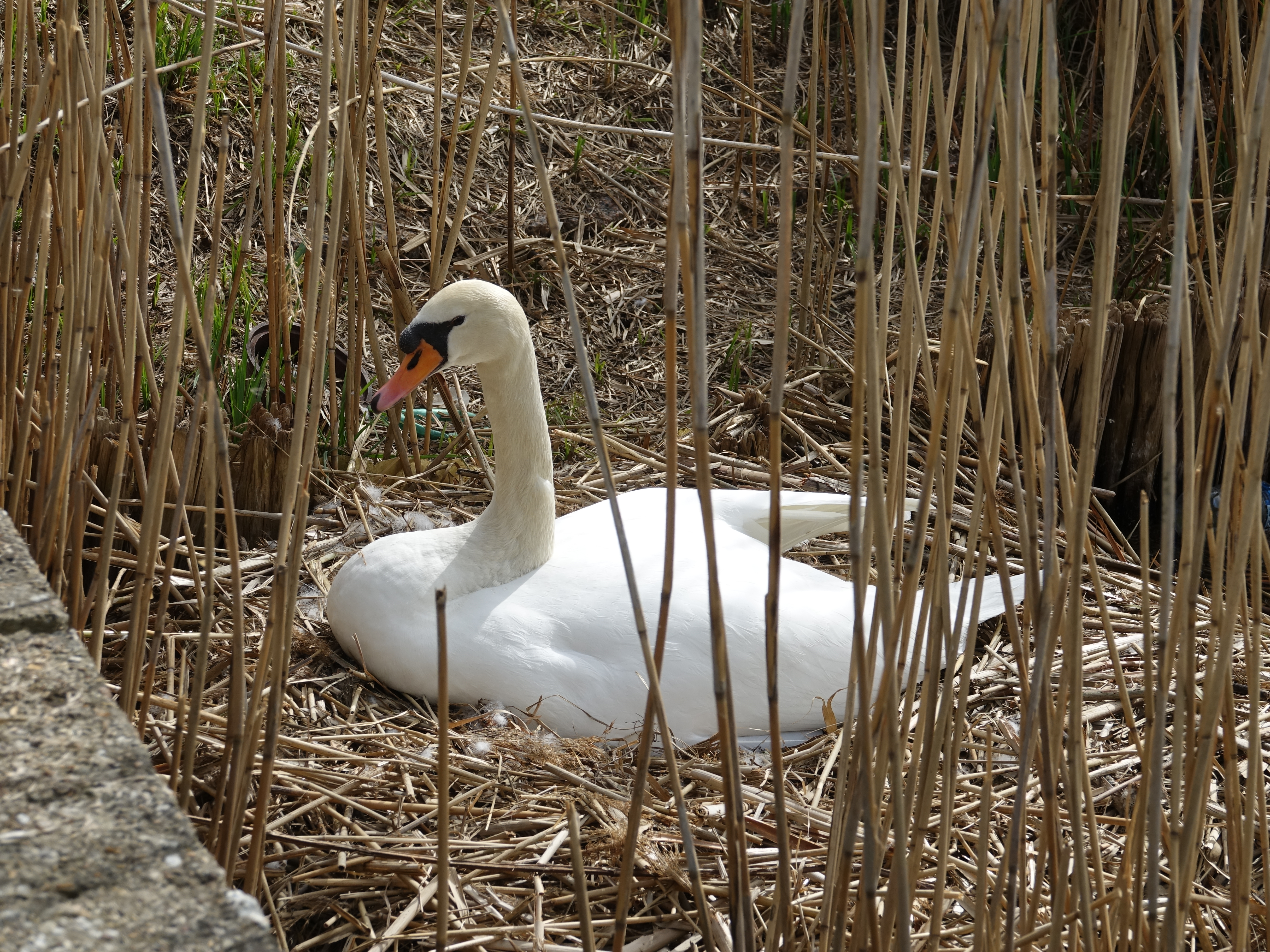 Les vedettes sont les grèbes : nous avons rencontré deux personnes qui, nous croisant un peu avant notre destination, nous ont hélés : « Ils sont nés. Ils sont nés ! Avec votre appareil, vous avez une chance de les prendre en photos ! » Seulement, si le couple de cygnes qui a construit son nid contre le quai se borne à siffler quand le regard insiste trop, les grèbes restent cachés derrière le rideau des roseaux.