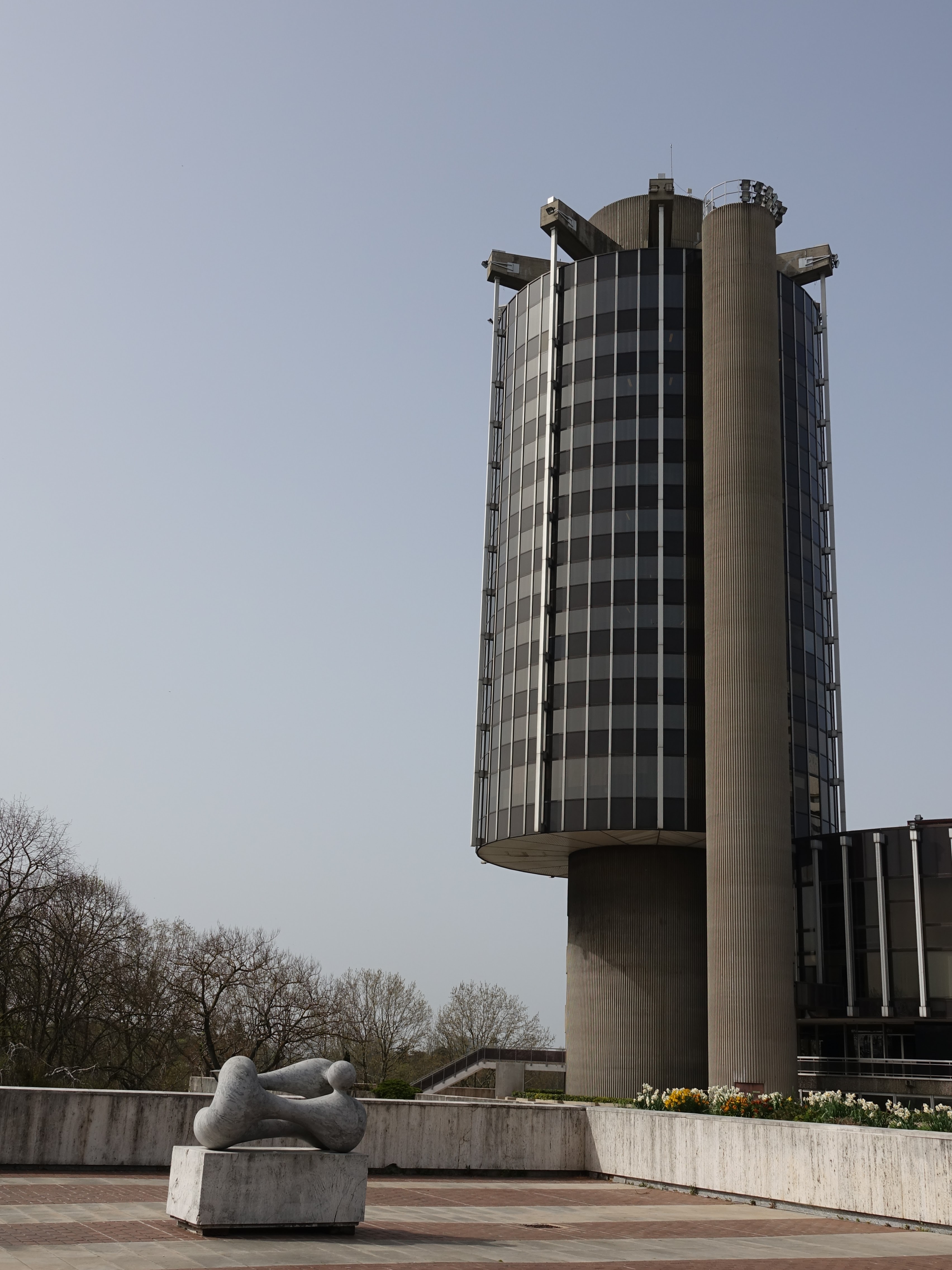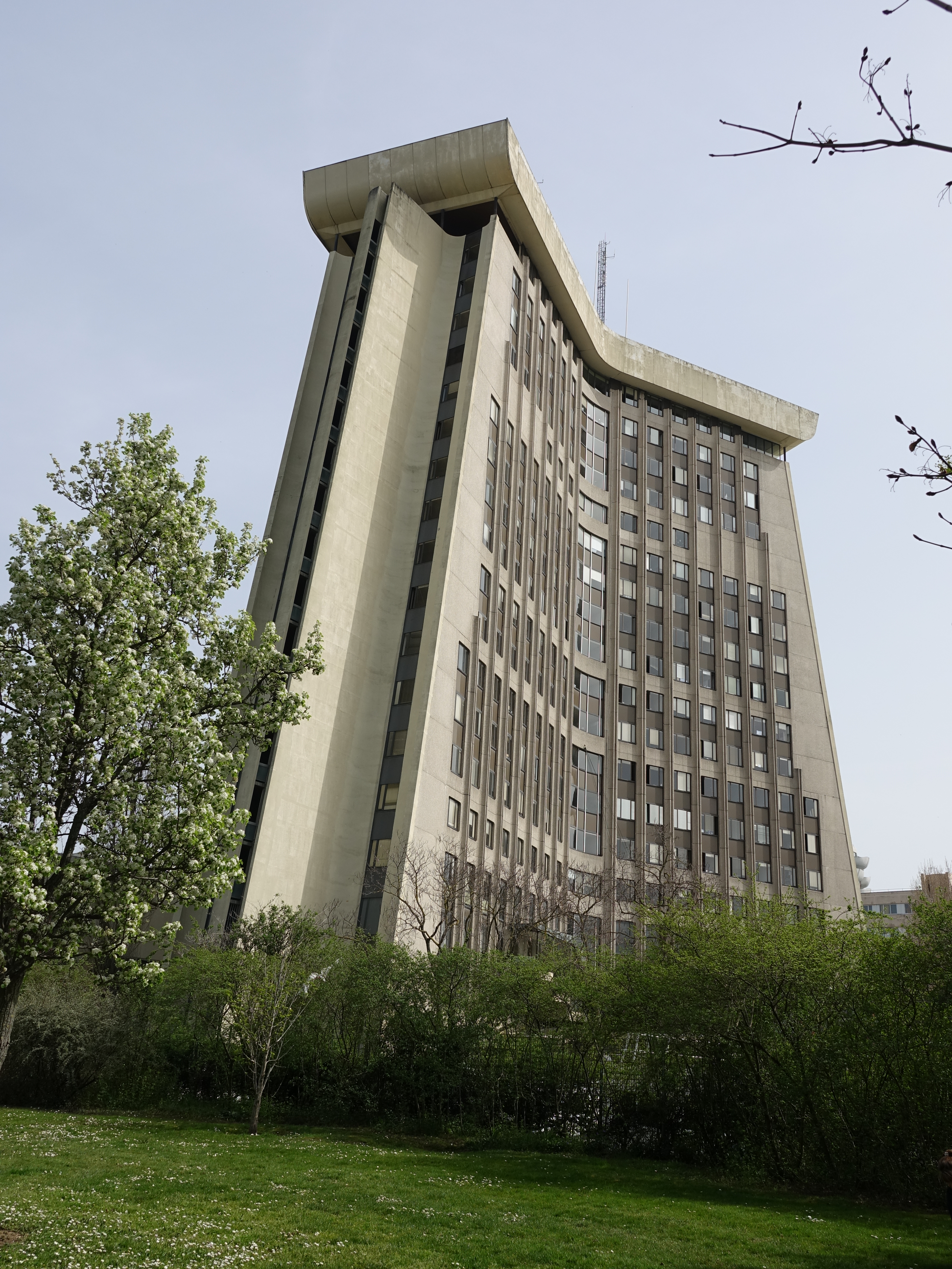 A l’Hôtel de Ville, dessiné par Dufau qui était aussi l’architecte qui animait l’équipe de 100 architectes chargés du Nouveau Créteil, le côté massif se confirme, avec ce côté bien français qui associe puissance publique et étalage de grandeur. On imagine le maire dans son bureau, situé dans les étages supérieurs, très loin de l’agitation de sa « bonne ville » de Créteil. Cependant la tour posée sur un cylindre de béton paraît suspendue dans le vide et fait montre d’une hardiesse sympathique.