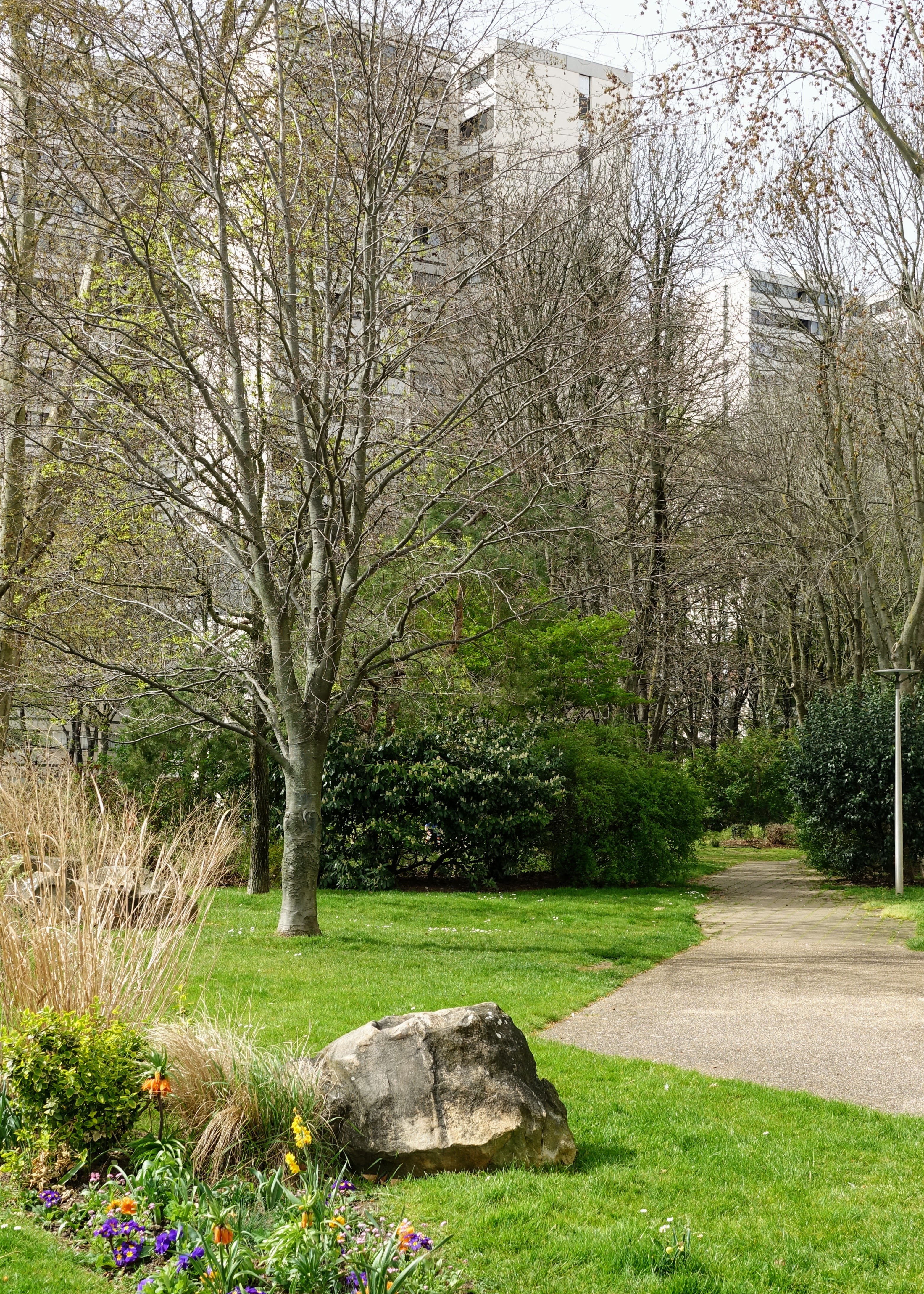 Nous partons vers le quartier des facs. Ce qui m’a paru remarquable pendant notre promenade est que Le Nouveau Créteil a été aménagé comme un tout. Il comporte les indispensables tours d’habitation, les boutiques qui équilibrent les centres commerciaux, les placettes où l’on peut s’arrêter le temps d’un verre… mais le plus précieux, ce 1er avril où il fait très beau, ce sont les itinéraires piétonniers bien distincts des routes, qui permettent de traverser un grand morceau de ville sans être gêné par les voitures. Pour faire ville, le chemin qui relie les bâtiments, (sinueux pour la beauté des courbes, mais pas trop afin que personne ne trace de raccourcis sauvages) est sûrement aussi important que le reste. « Au premier confinement, dit Myriam j’ai appris à regarder intensément chaque arbuste sur mon trajet. Mille détails des plantations ont accroché mon regard. Voir les tulipes et les myosotis s’épanouir devenait un évènement qui compensait l’enfermement. » (https://netsdevoyages.car.blog/2020/04/27/creteil-voyages-minuscules-dans-un-rayon-d1-km/)