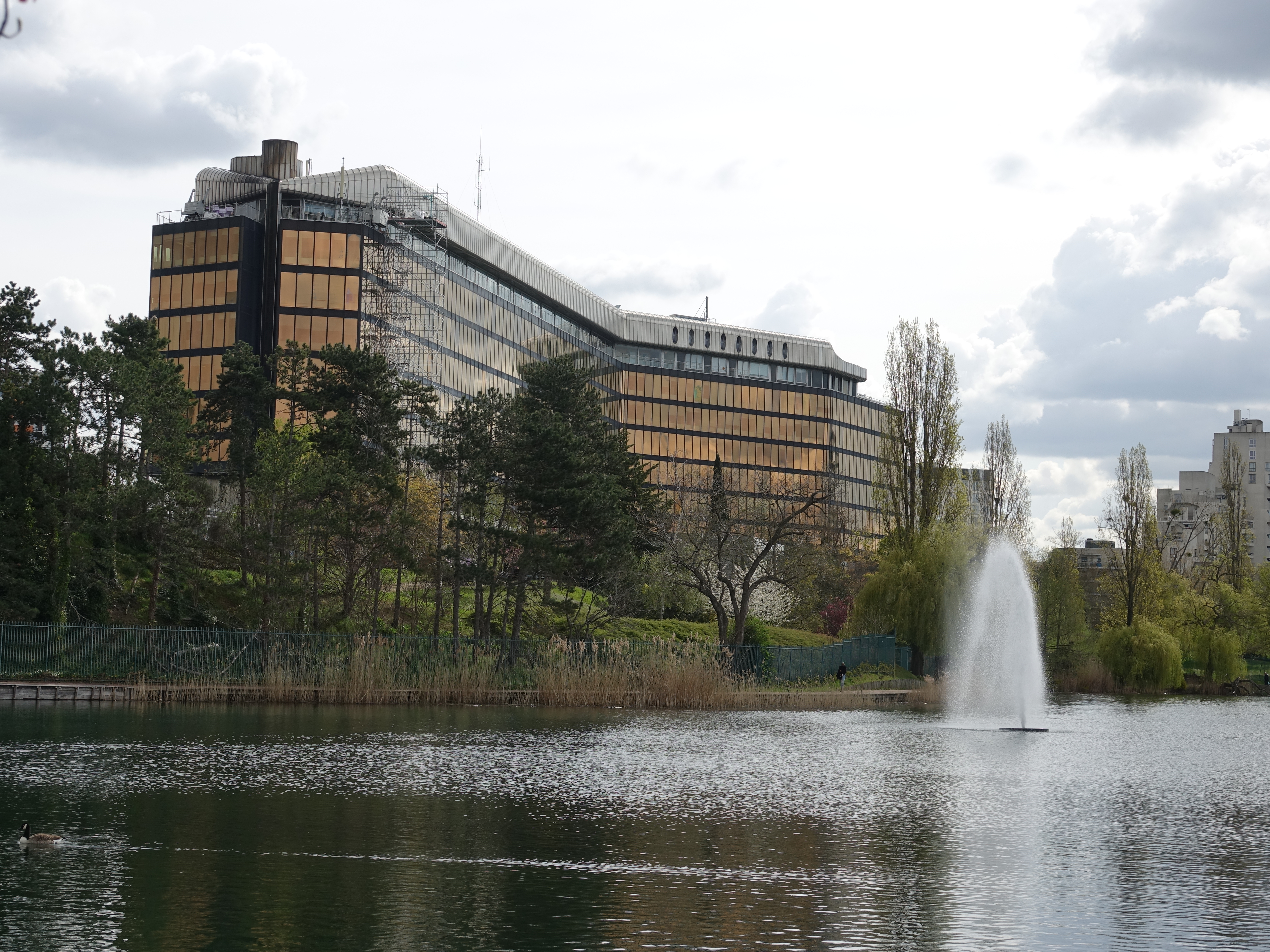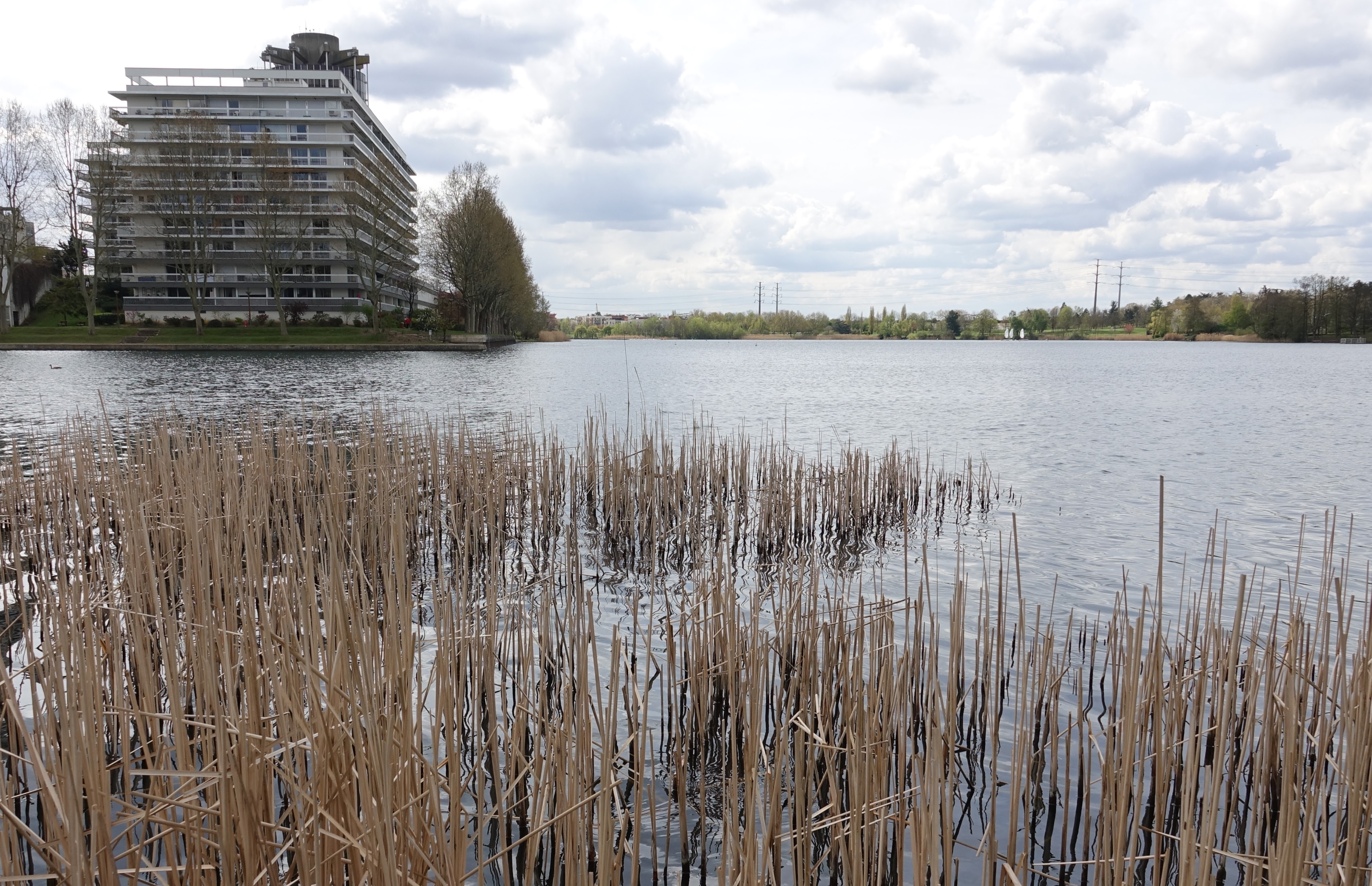 Préfecture du Val de Marne et jet d’eau du lac de CréteilCréteil. Roselière et immeubles