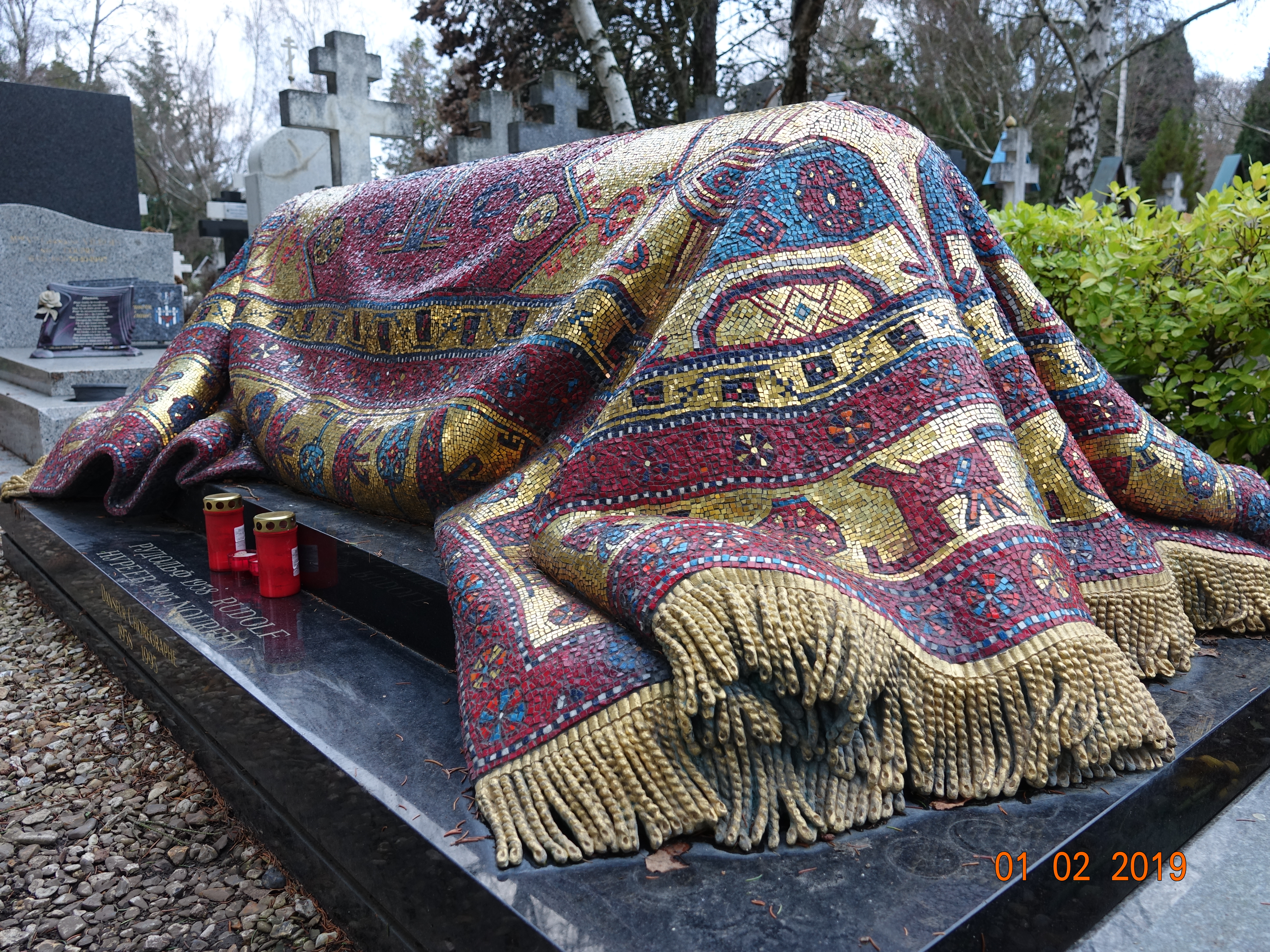 Beaucoup viennent pour voir la tombe du grand danseur Noureev qui a l’air recouverte d’un tapis oriental rouge, bleu et doré, en fait, une mosaïque conçue par le décorateur Enzo Frigerio, compagnon de Noureev.