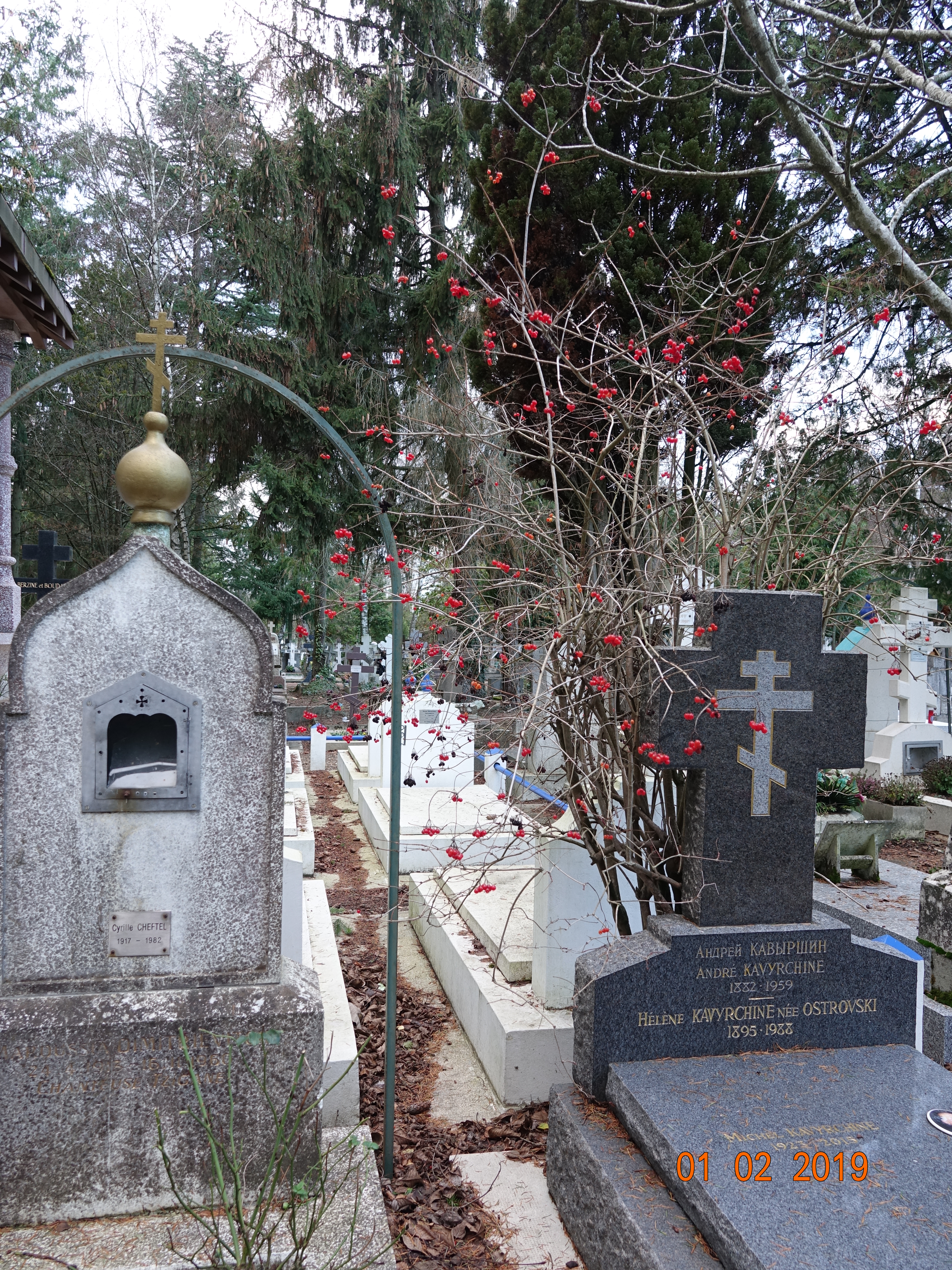 Mais on peut se promener dans un charmant jardin « à la russe » : bouleaux, ifs, épicéas par centaines, pins qui se mêlent aux tombes orthodoxes surmontées de petits bulbes bleus ou dorés.