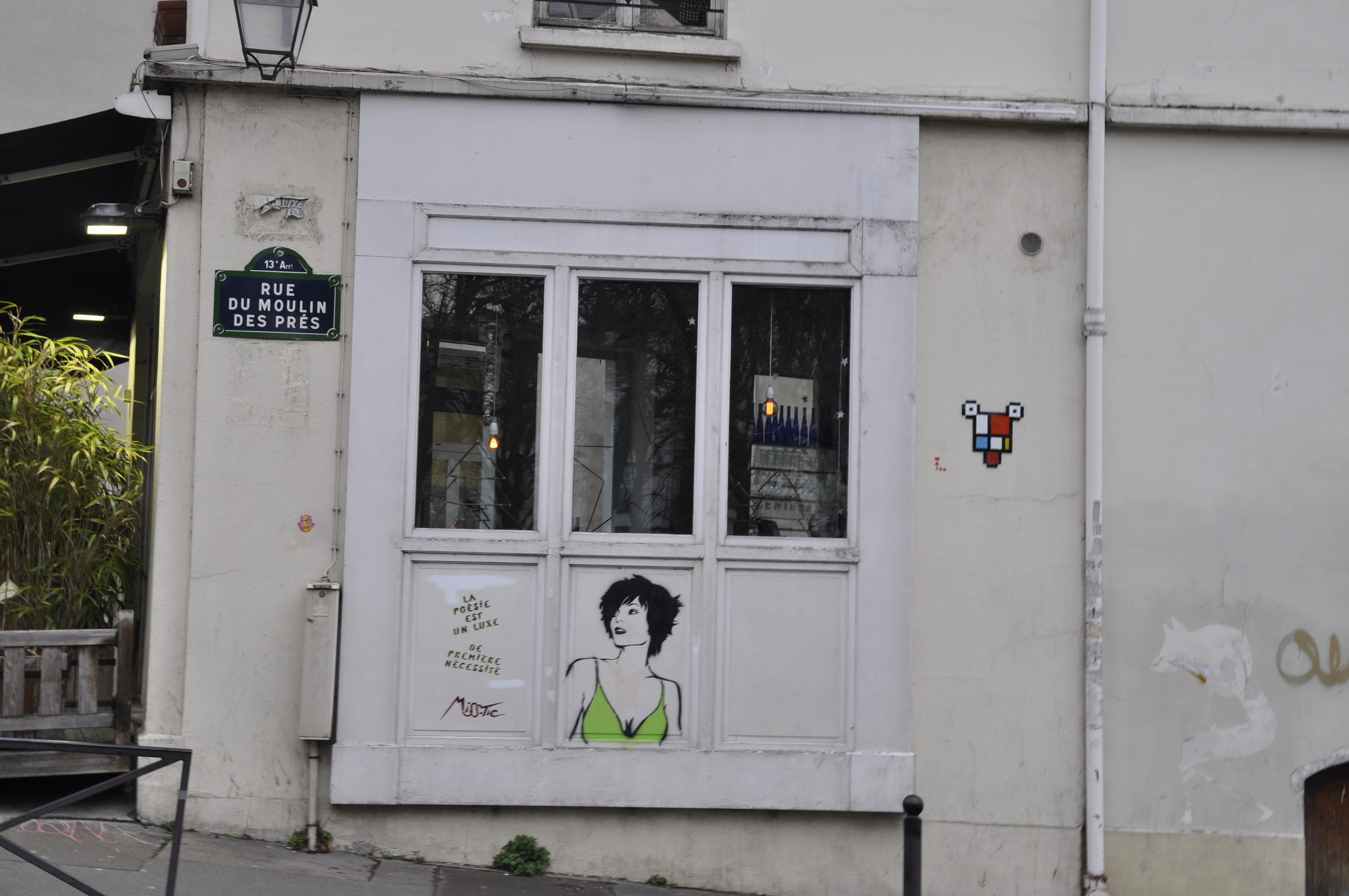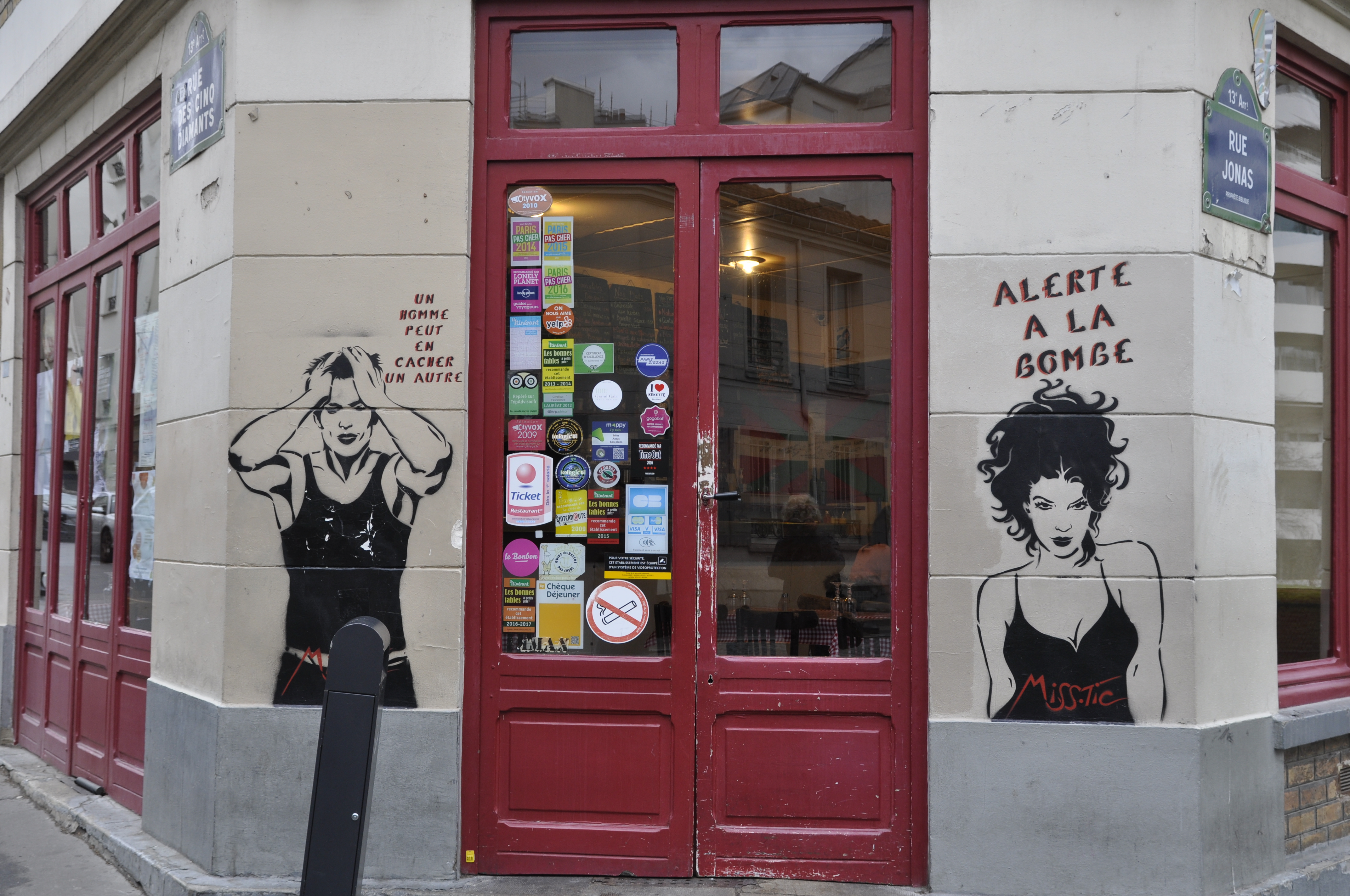 Quant on sort du restaurant, on peut arpenter les rues pavées Paulin Mery et rue Gérard, photographier les oeuvres de street art…Dans ce haut lieu de l’art de rue, j’aime surtout les pochoirs de Miss-Tic, qui signe d’un pseudo féminin, redoublant les images qu’elle installe un peu partout dans le quartier, et qui la montrent en belle jeune femme charnelle, chasseuse d’hommes sans culpabilité.