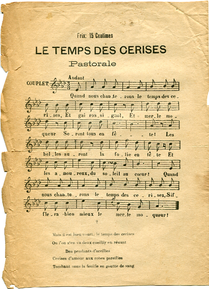 Je crois bien que Le Temps des cerises a été composé par Jean-Baptiste Clément en souvenir d’une infirmière de la Butte, tombée sous les balles des Versaillais. Aujourd’hui, c’est un nom de café !
