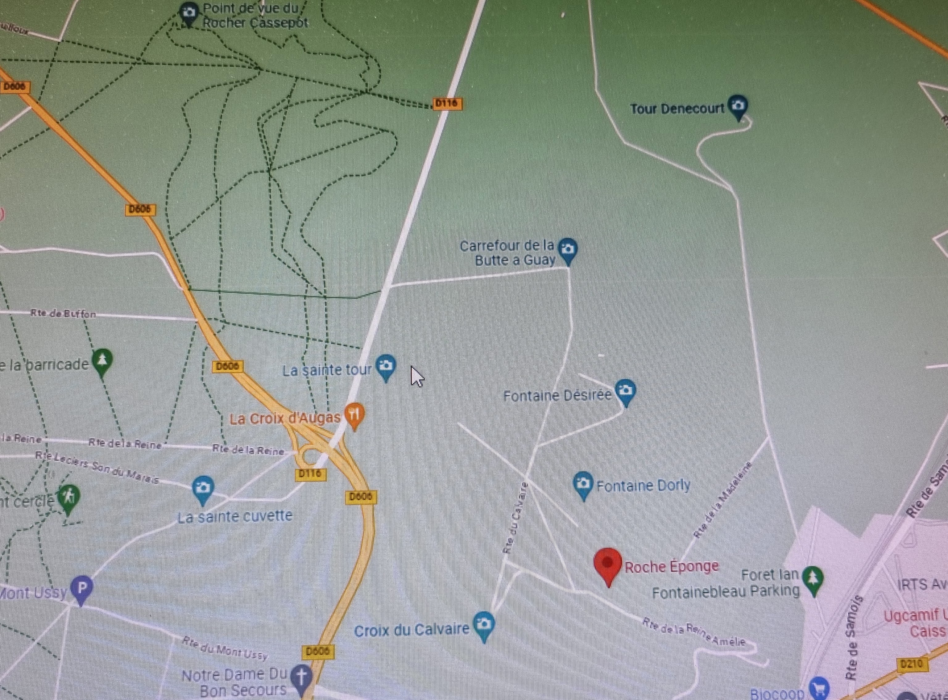 On les avait attendus pendant qu’ils se perdaient, rebroussaient chemin, repartaient sans trouver la route forestière de la reine Amélie. A la fin cependant, ils étaient parvenus au parking où ils avaient retrouvé leurs amis affamés et stoïques qui patientaient. Le sentier Denecourt n°2, point de départ de leur promenade, est situé tout près de la gare d’Avon, inaugurée en 1849. Il rappelle le temps où la forêt est devenue accessible aux Parisiens pourvu qu’ils puissent payer le prix du trajet, équivalent à un jour de salaire d’ouvrier. Pour ces premiers touristes, peintres, écrivains, bourgeois… Denecourt avait inventé des balisages bleus, marques d’orientation permettant d’explorer la forêt sans se perdre, il avait même fait ajouter par les carriers quelques défilés romantiques de son goût. (voir https://passagedutemps.com/2020/05/18/le-chemin-des-25-bosses-a-partir-du-cimetiere-du-vaudoue-fontainebleau/)