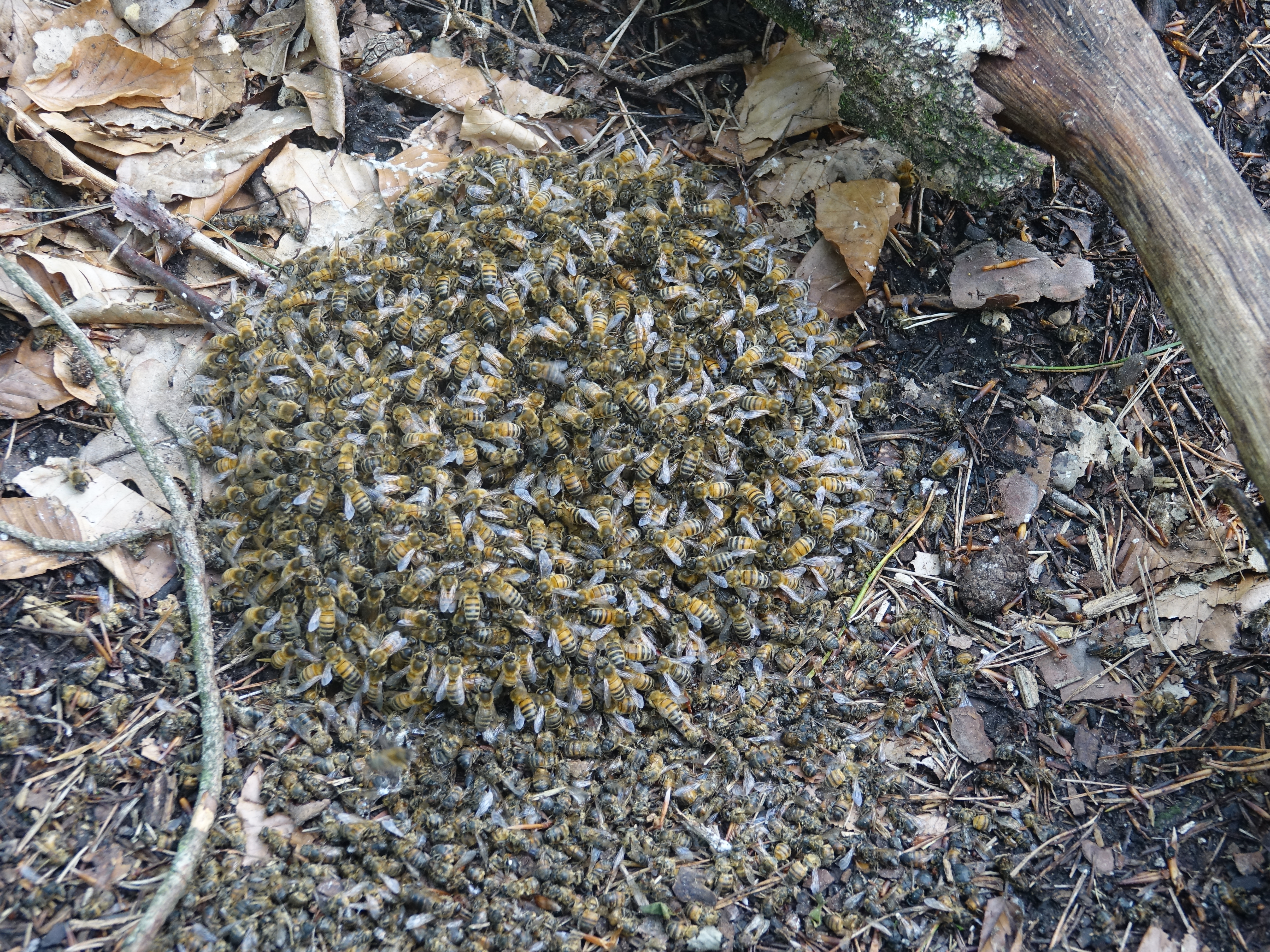 Il suffit cependant d’être dans la bonne disposition d’esprit pour voir surgir des merveilles. Cet essaim d’abeilles installé au bord du chemin, brun gris, presque confondu avec les feuilles mortes. D’où viennent ces abeilles sauvages ? Est-ce qu’elles vivent dans le creux des chemins ? Est-ce qu’elles se sont égarées comme nous ?