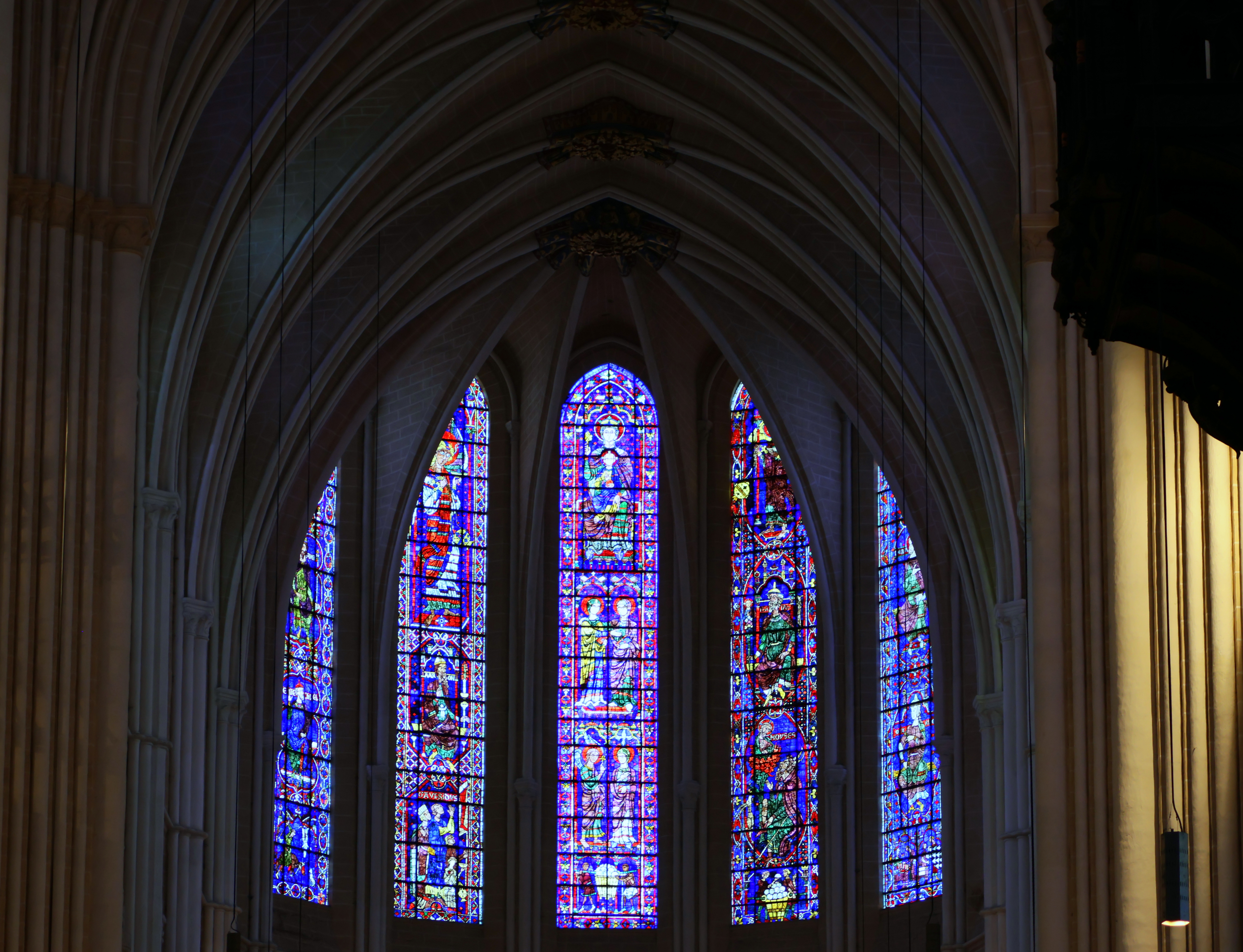 Dès qu’on lève les yeux, quelque chose en nous chavire devant la projection des hauts piliers ménageant entre les pierres les vitraux qui ont fait la gloire de la cathédrale.