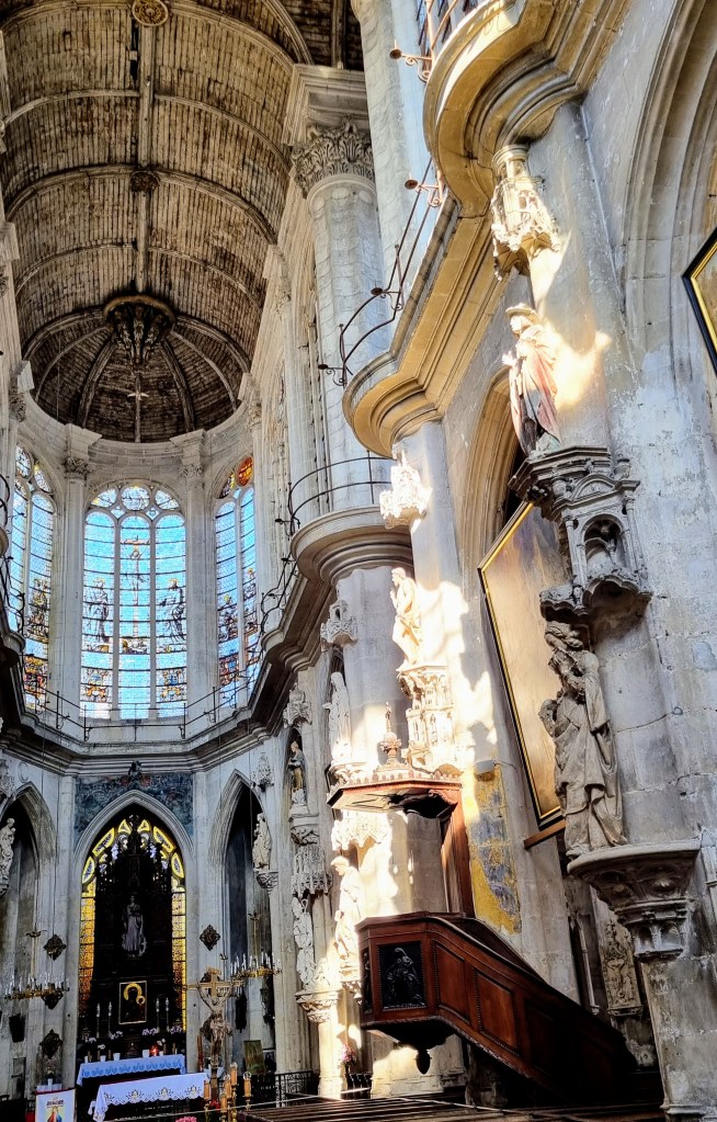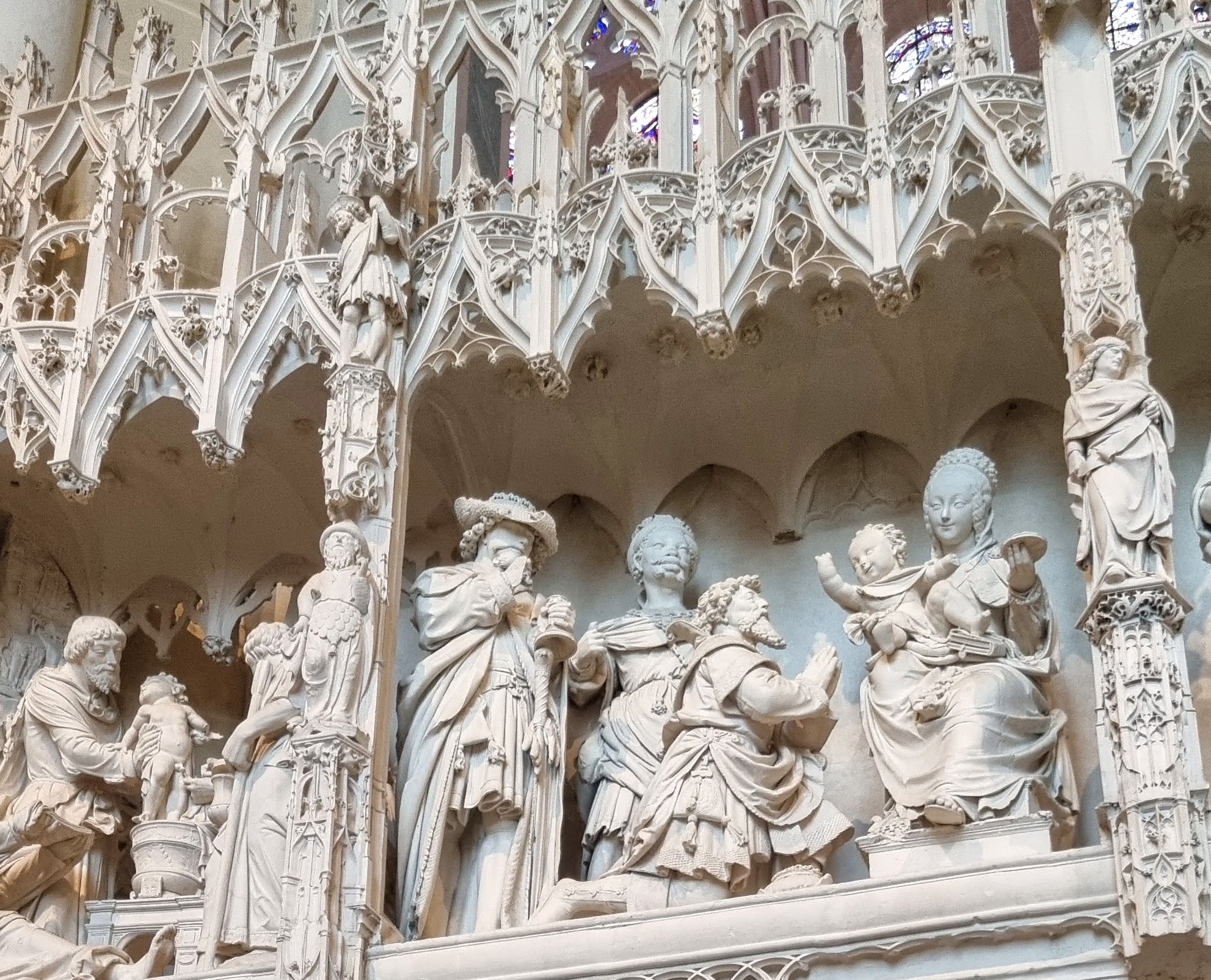 Nous regardons rapidement les statues du 16e et du 17e qui font le tour extérieur de la clôture du chœur. Il est vrai que l’aimable Marie qui présente son enfant aux Mages n’a pas grand-chose de commun avec Notre-Dame de la belle Verrière dont Claudel écrit quelque part qu’il ne sait si elle le regarde avec une bouche triste ou si elle sourit. La dentelle de pierre qui encadre la scénette du 16e siècle est presque trop gracieuse.