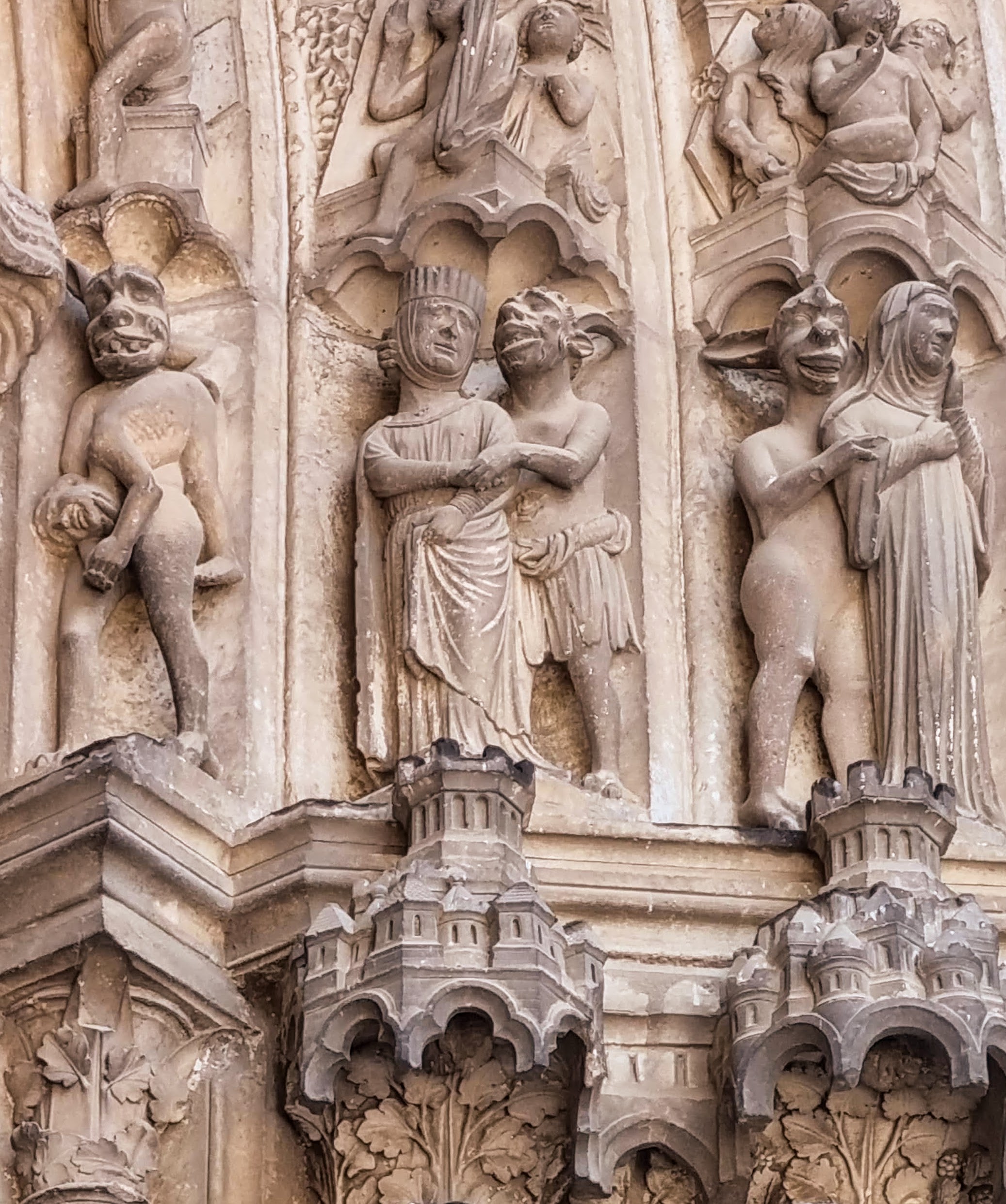 Elle est indifférente aux scènes de la pesée des âmes où le sculpteur montre joyeusement des diables embarquant vers l’enfer sa cargaison de pêcheurs, y compris une religieuse qui s’est sans doute laissé séduire par le rire engageant du démon. J’aime au contraire ce goût pour le rire et j’aurais voulu que son commentaire fasse une place aux diables divertissants qui bousculent la frontière du saint et du profane.