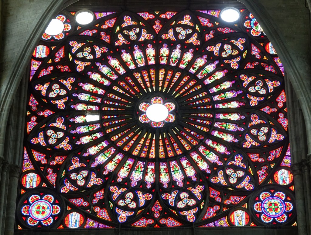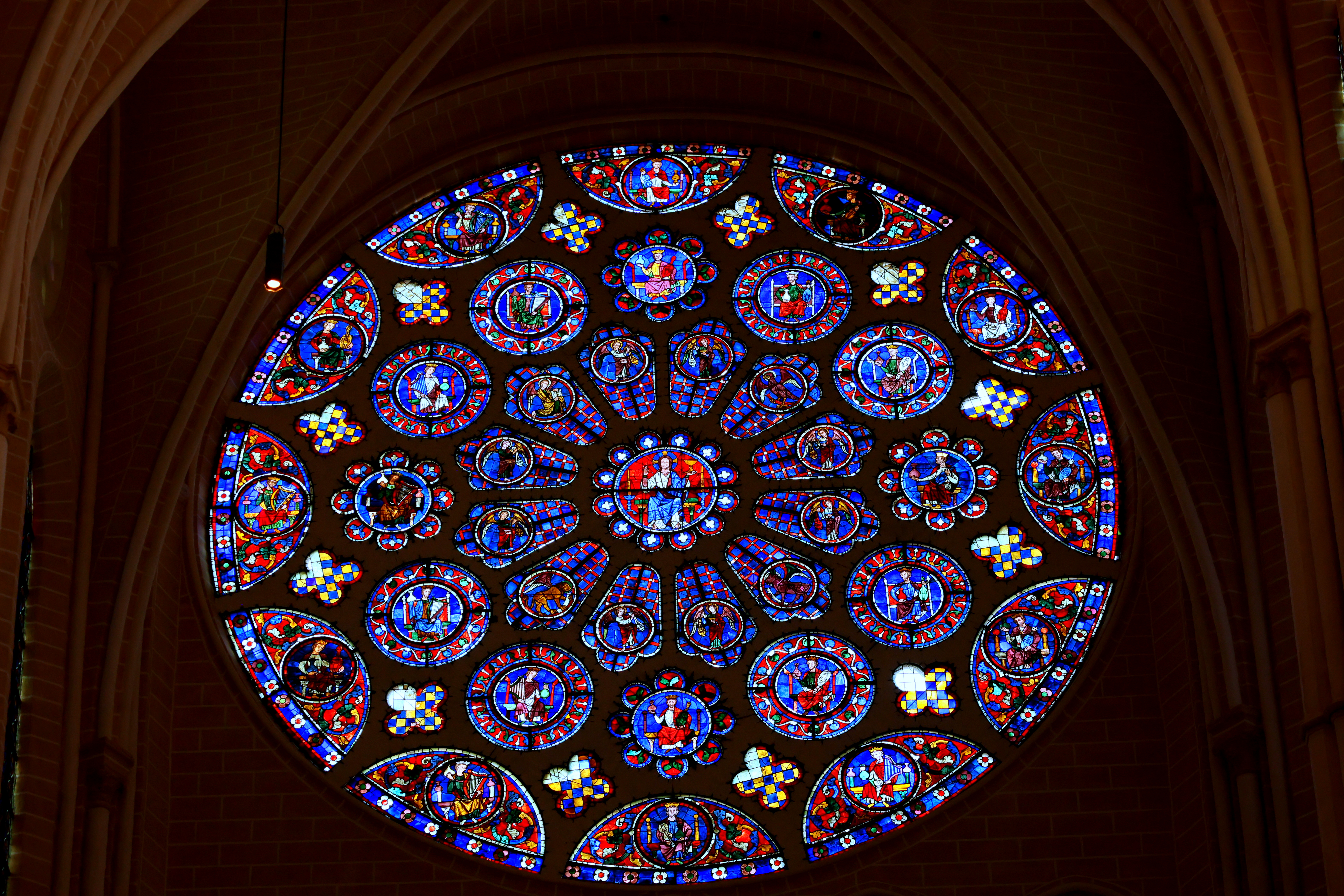 lLe vitrail de l’Ouest qui date du 19e siècle est une rosace pourpre encadrée de murs sombres.