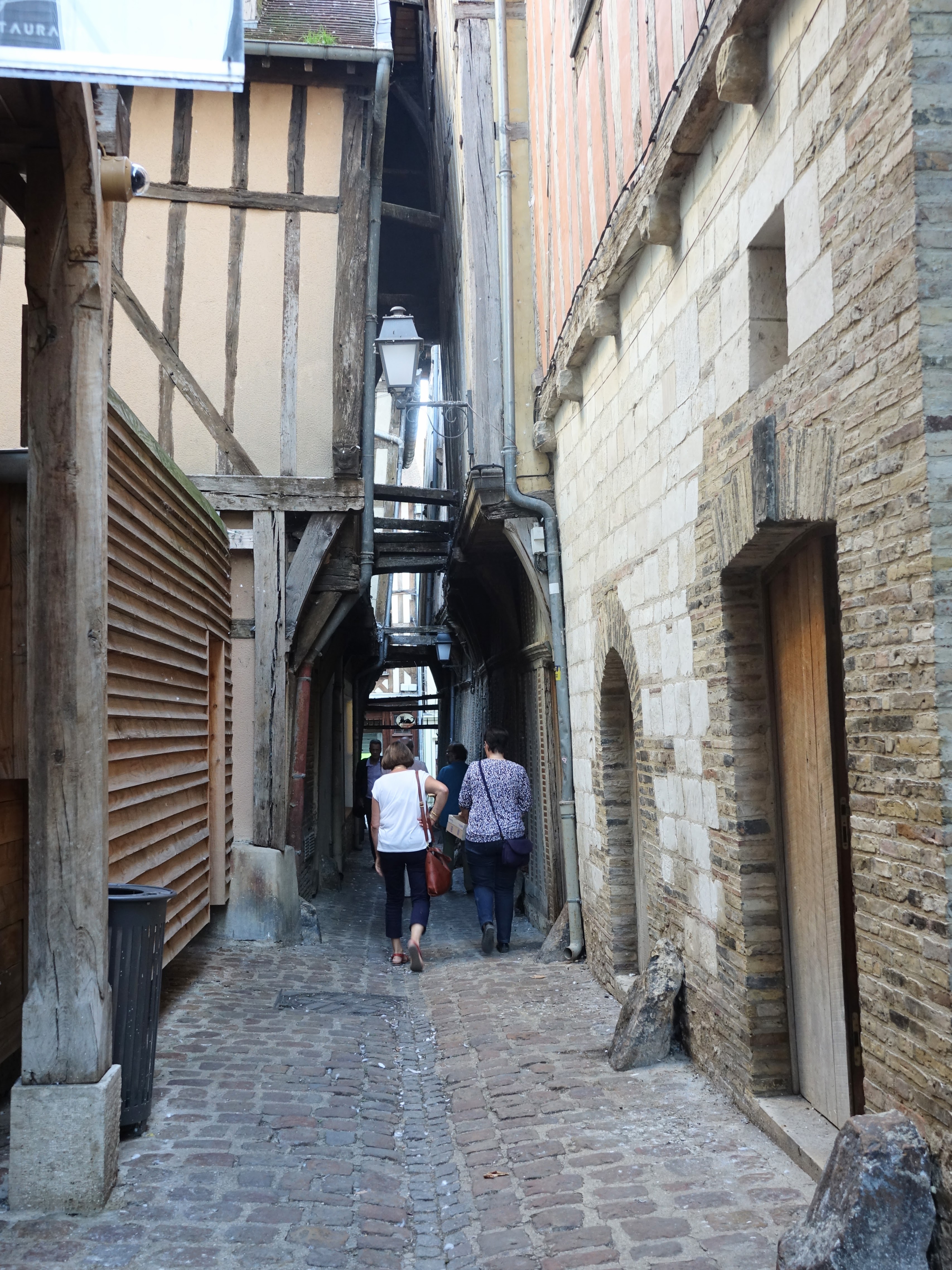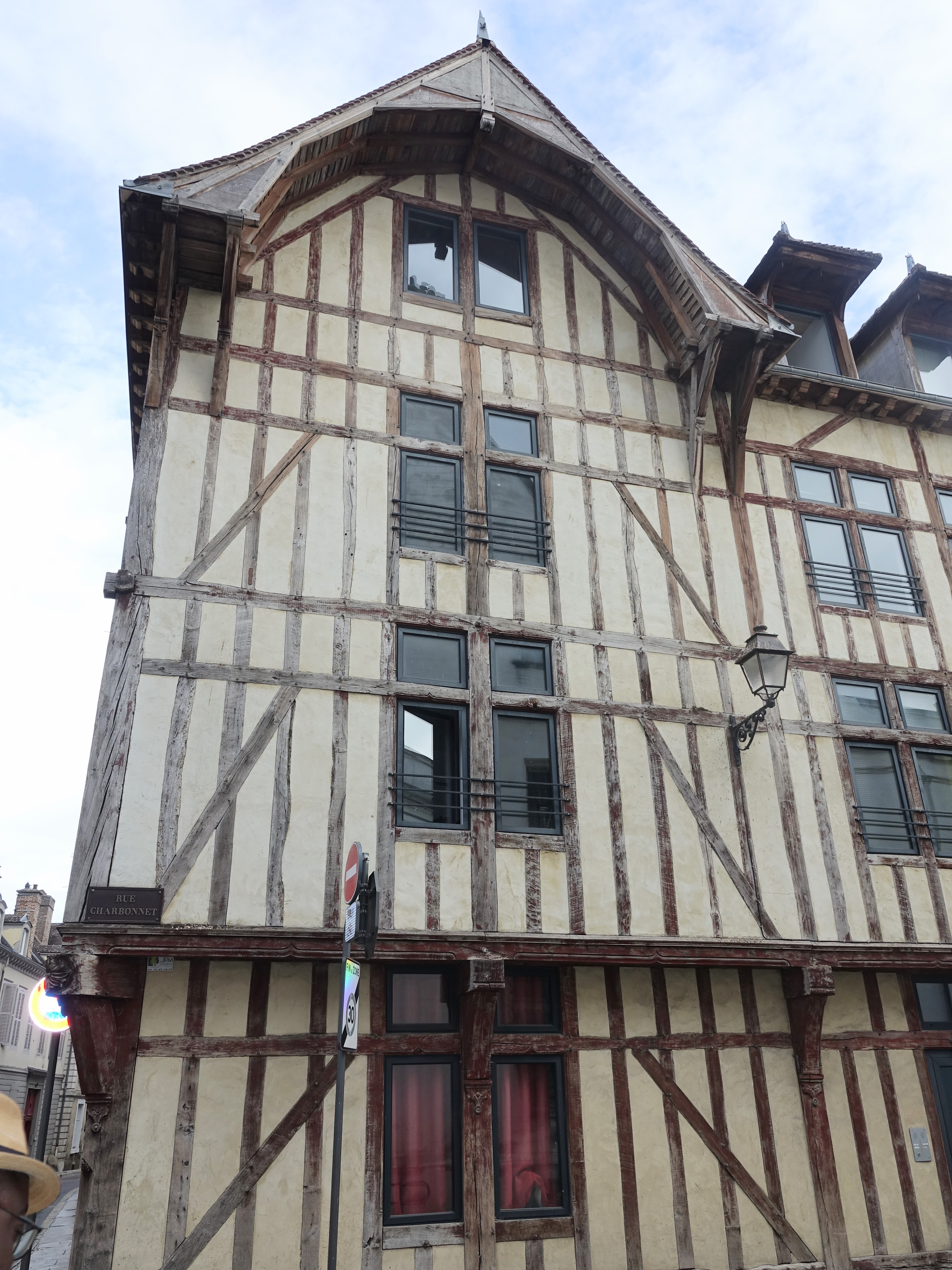 Cependant on arrive à Troyes et tout de suite aux ravissantes maisons à pans de bois. Partout en ville, il y a des façades où les poutres dessinent des dessins géométriques, lignes verticales croisant des appuis obliques, partout de hauts pignons coiffés d’un bonnet pointu.