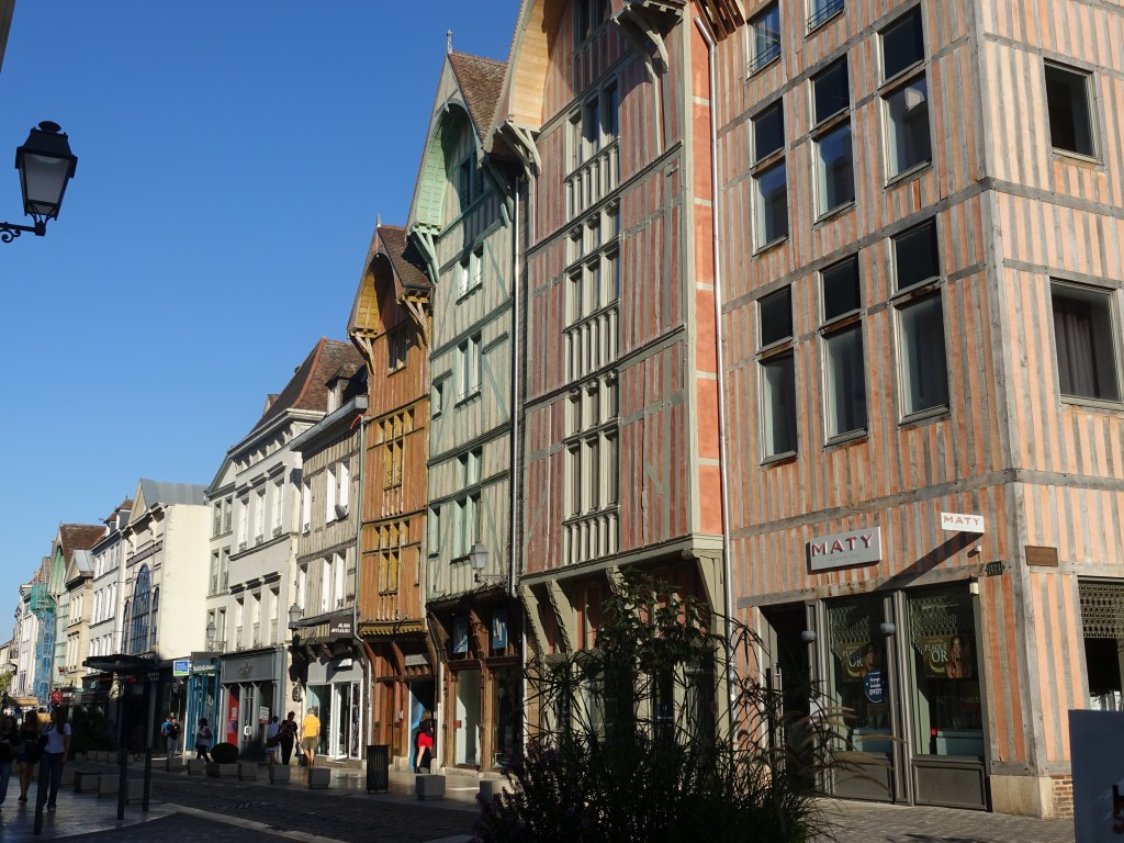 Ces maisons ont été bâties après le grand incendie de 1524 qui a conduit à rebâtir le tiers de la ville. Un édit de Sully obligeait à recouvrir l’ossature de bois par des crépis que le temps dégrada. Il n’y a pas si longtemps, Troyes était une ville délabrée et triste. Aujourd’hui, on a ôté les enduits, repeint le plâtre entre les poutres en couleurs ocre, rose, vert tendre.