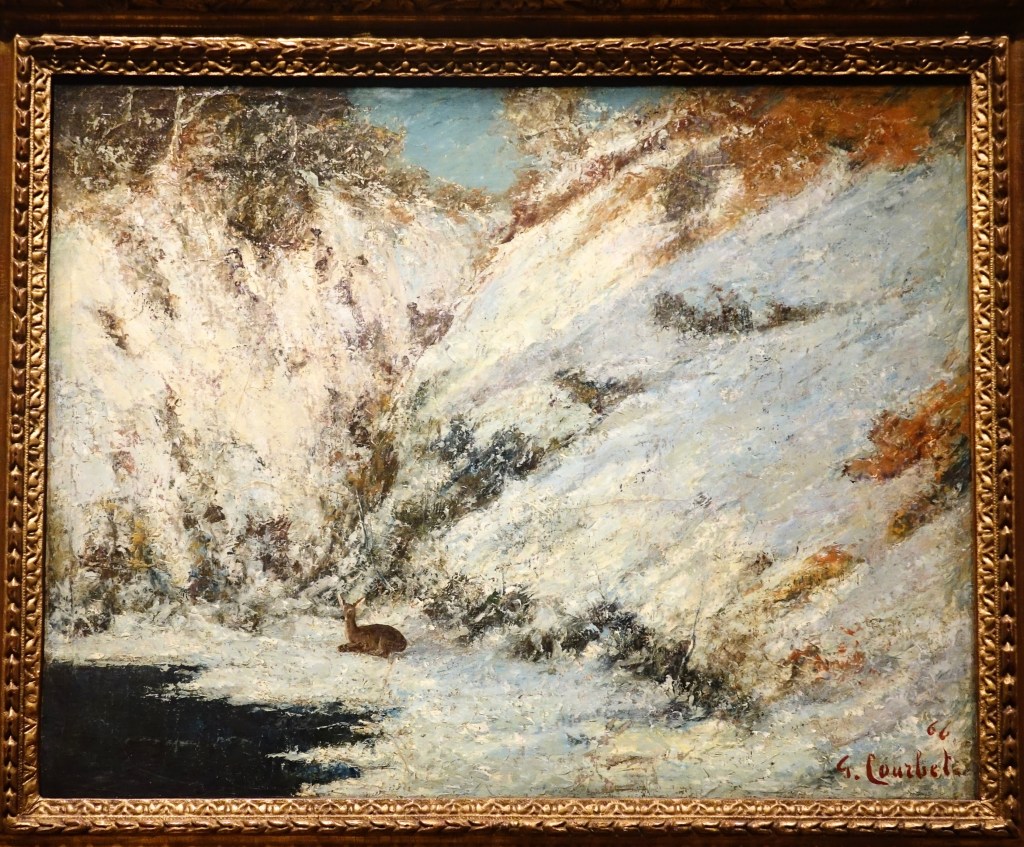 Parmi tant de merveilles voici une biche de Courbet. D’où vient la lumière ? Pas du ciel, figuré seulement par un petit triangle bleu, mais de la neige elle-même, matière légère, crémeuse, nacrée, irisée. Elle n’est pas blanche, mais composée de dix couleurs différentes, tons bleus, tons ocre des arêtes du vallon juxtaposés en touches palpitantes. Comme après lui Sisley ou Monet, Courbet ne peint pas la neige sans évoquer les ombres noires. Ici c’est un arbre qui menace d’éteindre la lumière et le chevreuil isolé dans le vallon creux dont on ne sait s’il attend les chasseurs et la mort ou s’il se croit à l’abri.