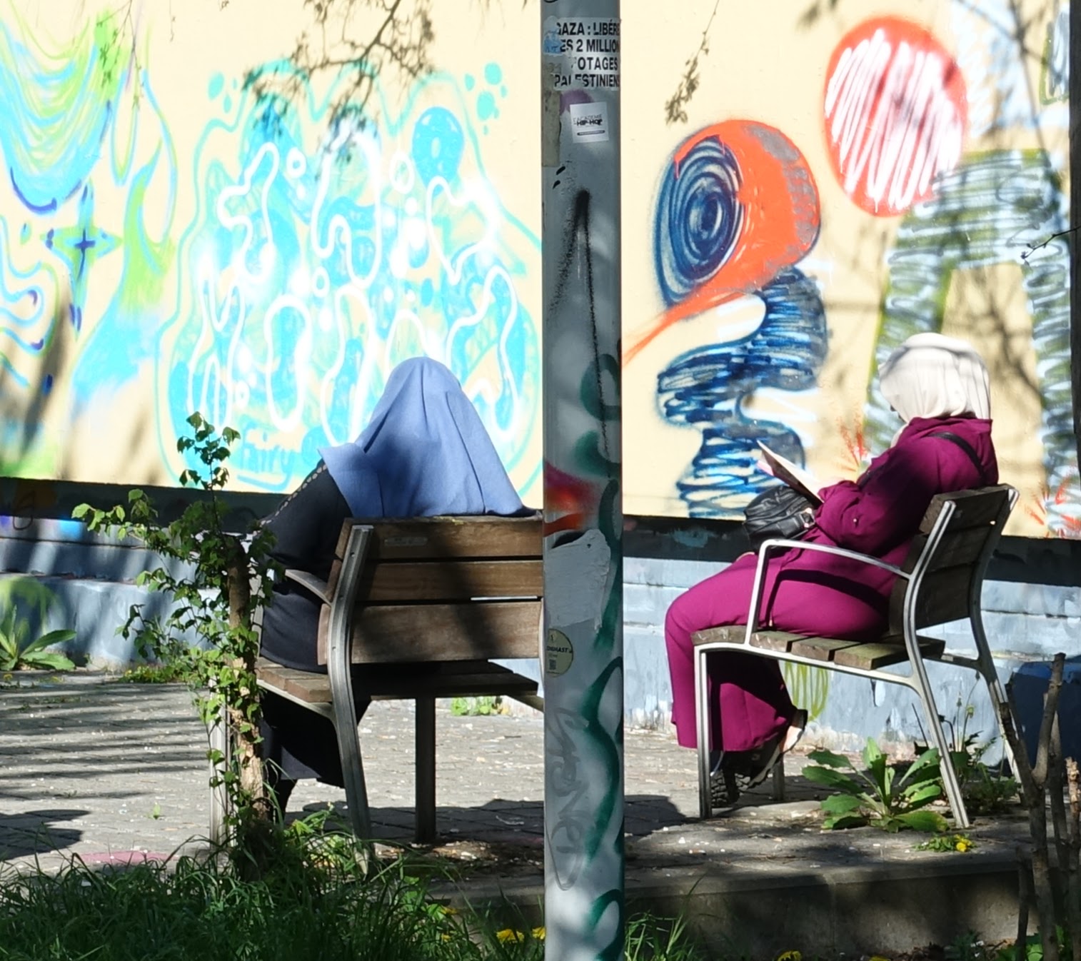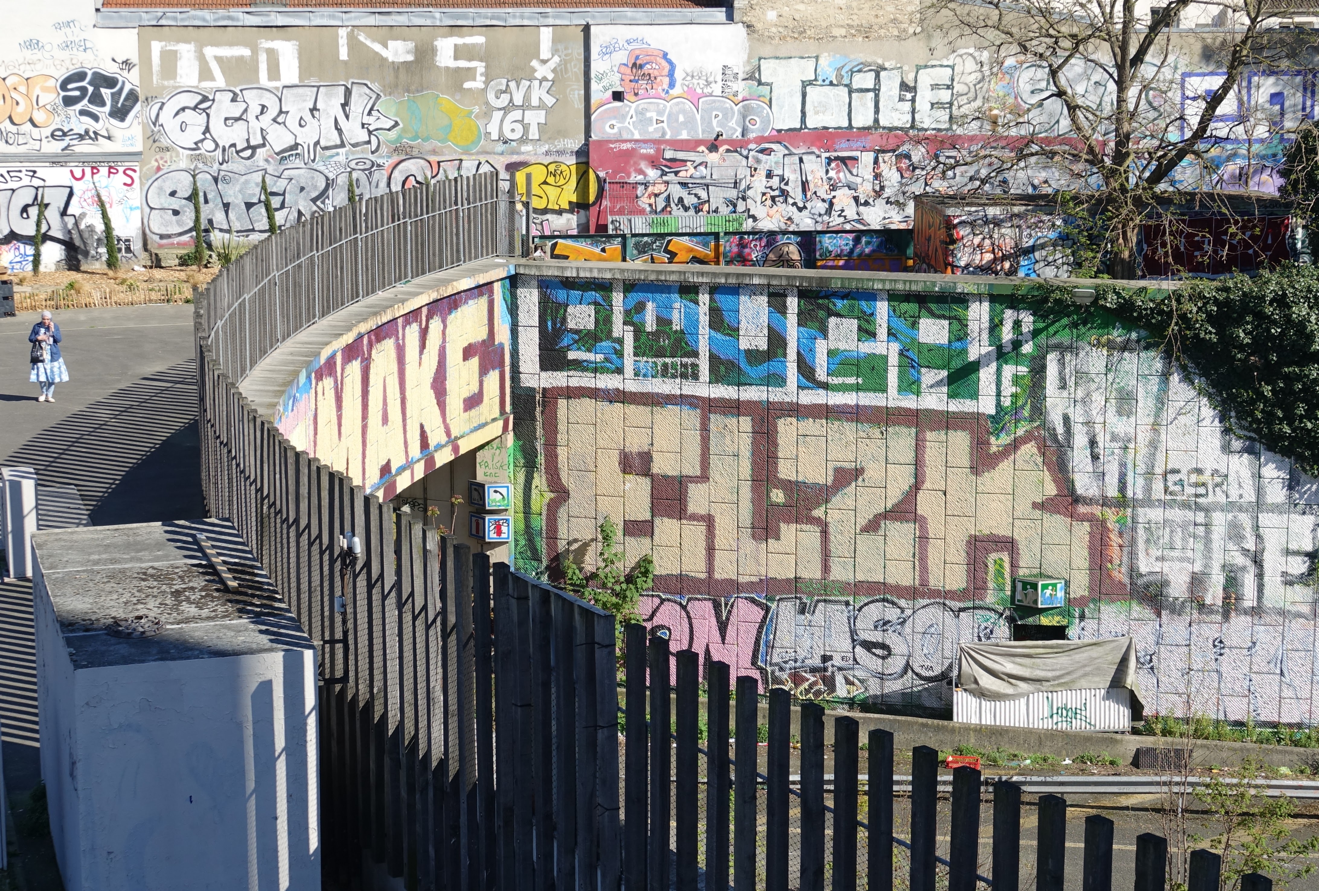 Les habitants de Gentilly qui prennent la passerelle rejoignent leurs immeubles en suivant une petite allée coincée entre l’église et l’autoroute. Ils longent le terrain de joueurs de pétanque et les coins où des chaises ont été installées sous les cerisiers, juste sous le mur anti-bruit.