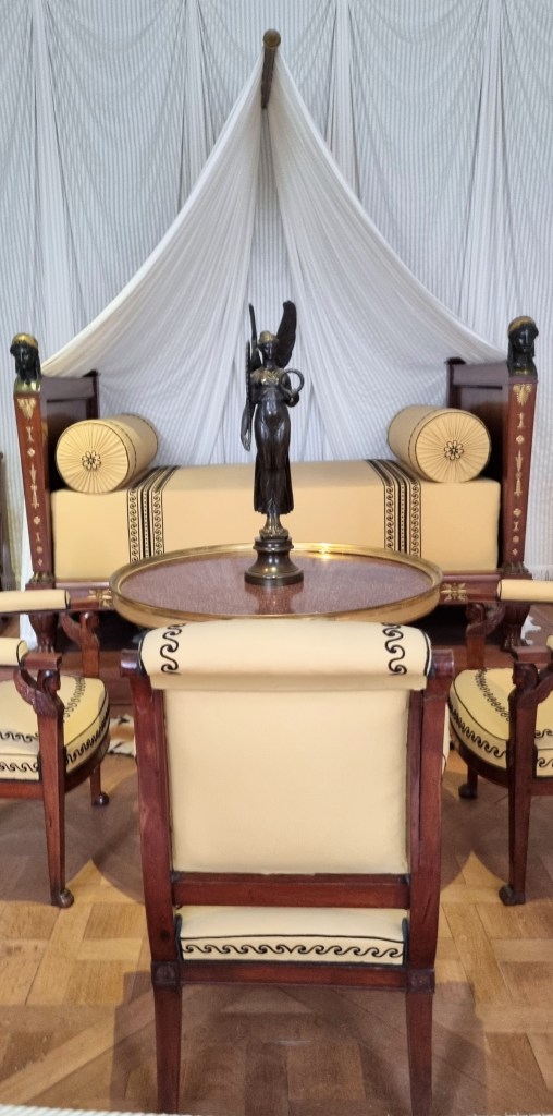Nous nous sommes vite mis à l’abri. Seule, j’aurais parcouru trop vite une demeure qui « n’est pas mon style ». Grâce à notre guide, Marie, à la fois savante (mais pas trop) et intéressée par son sujet, j’ai commencé à voir ce que le style Empire avait d’unique.