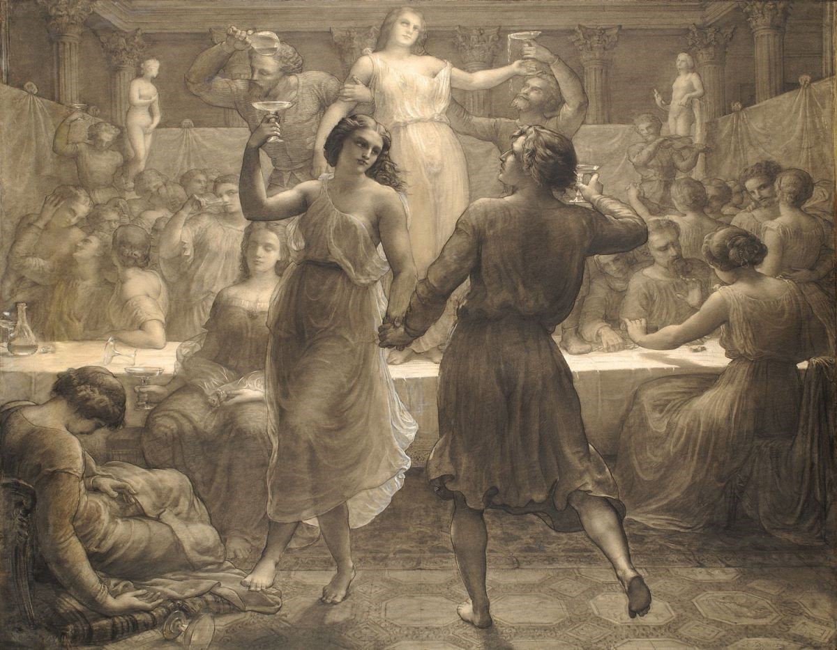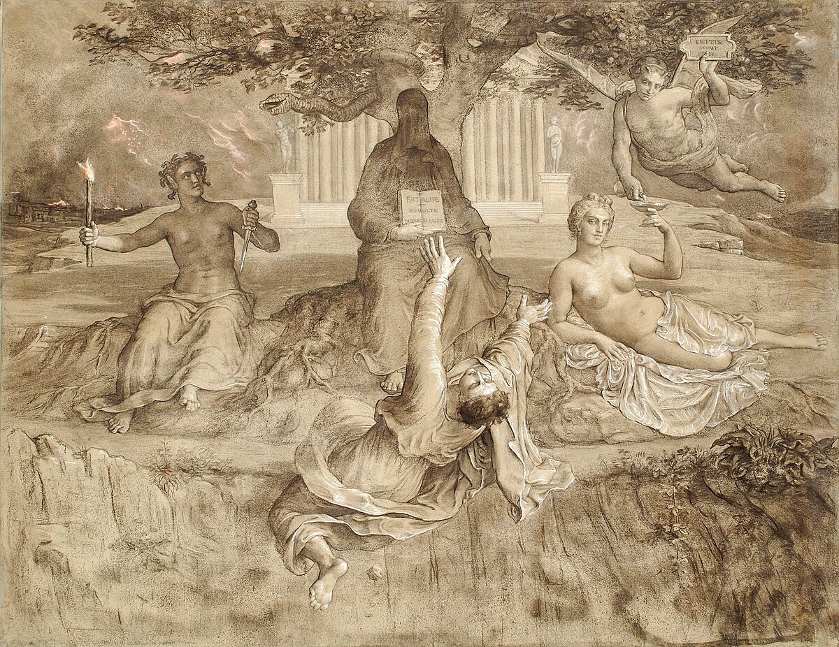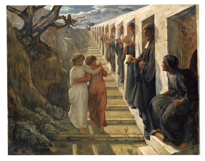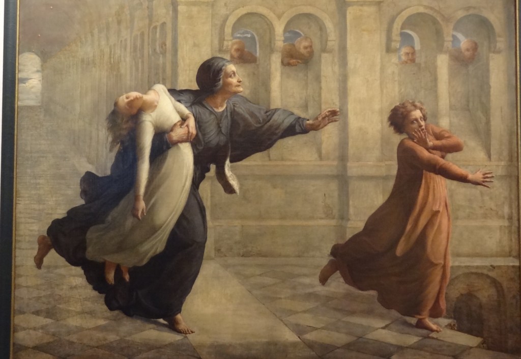 Ces nymphes ressemblent au bas-relief sacré de l’ensevelissement du Christ. Les femmes sont charmantes même dans la douleur, les coiffures forment des entrelacs compliqués (la Madeleine)