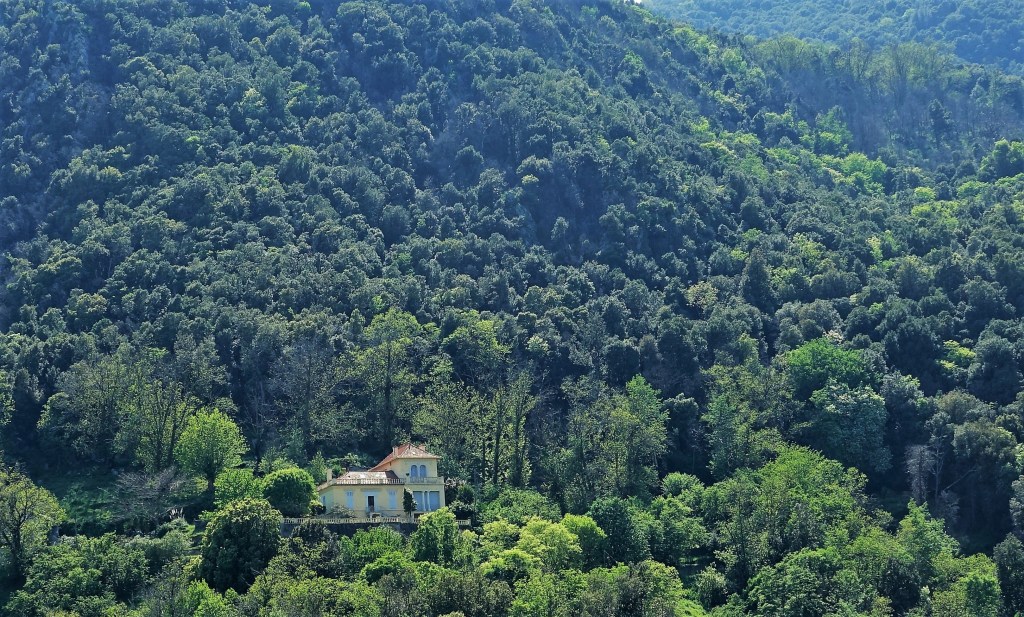 Si l’on se retourne vers les collines, on voit de minuscules villages. Je crois que celui-ci est Santa Maria di Lota.