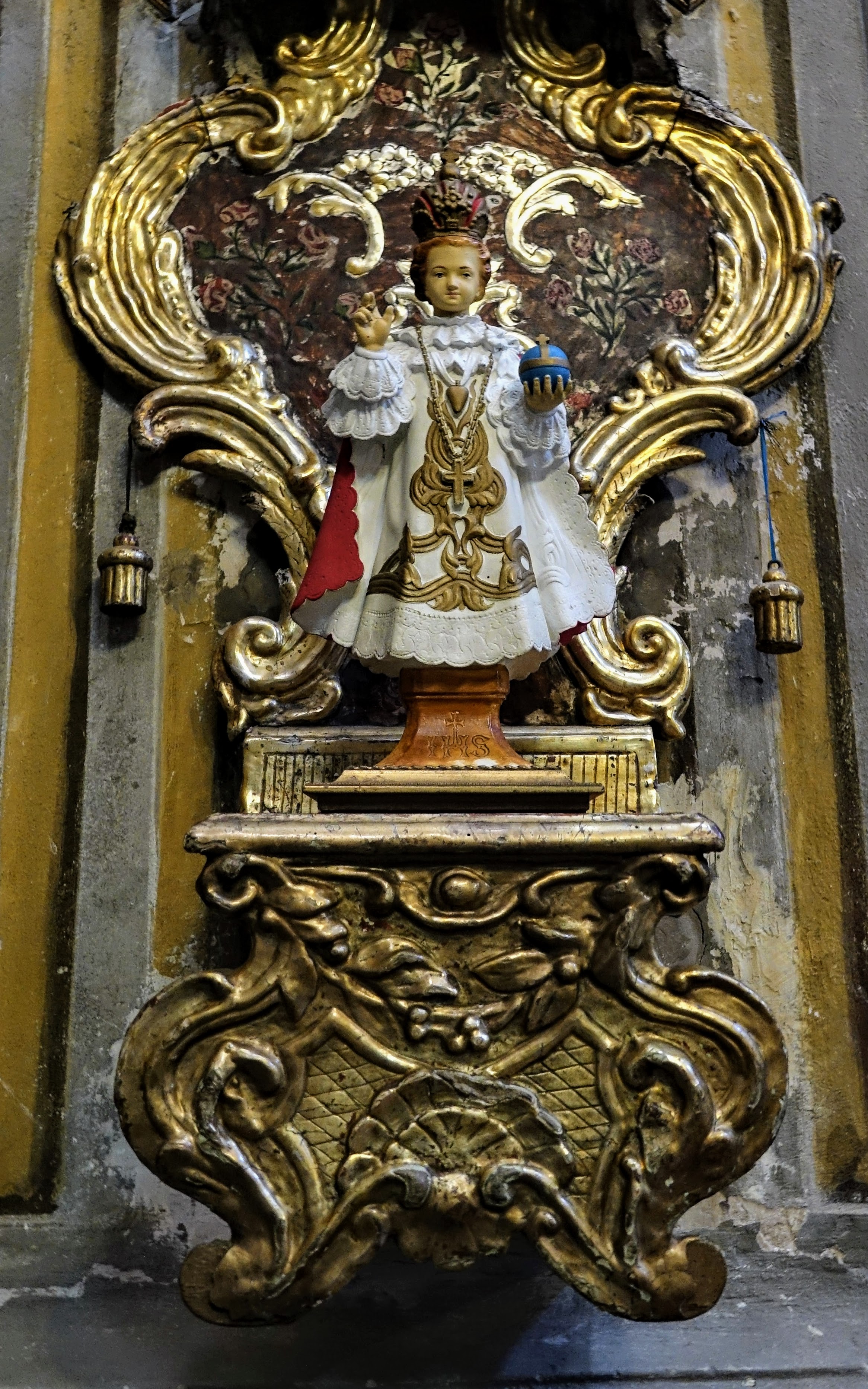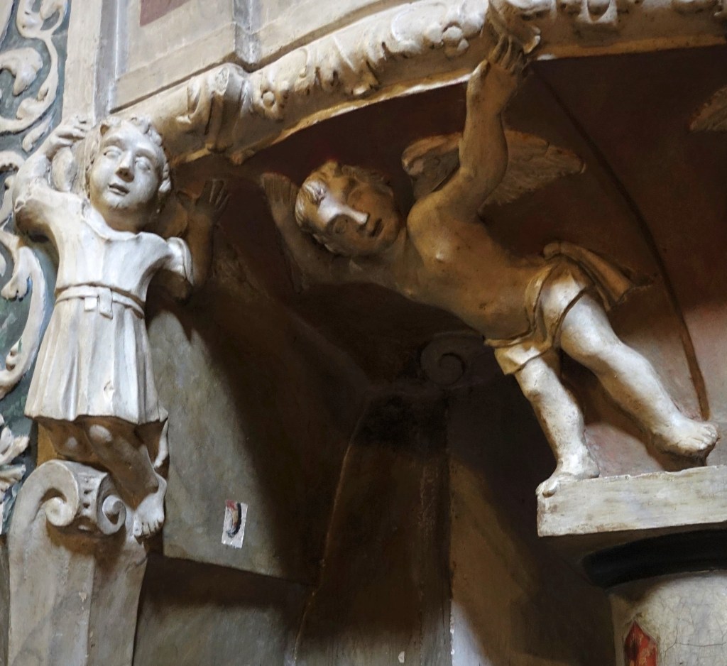 Nous faisons quand même un petit tour à l’église baroque, ex-cathédrale Saint-Erasme, admirant l’envol de deux anges baroques, souriant du luxe avec lequel on a habillé un poupon figurant l’enfant Jésus ; je vois surtout ses belles manchettes brodées et je me demande quelle vieille femme pieuse lave et repasse ce vêtement.