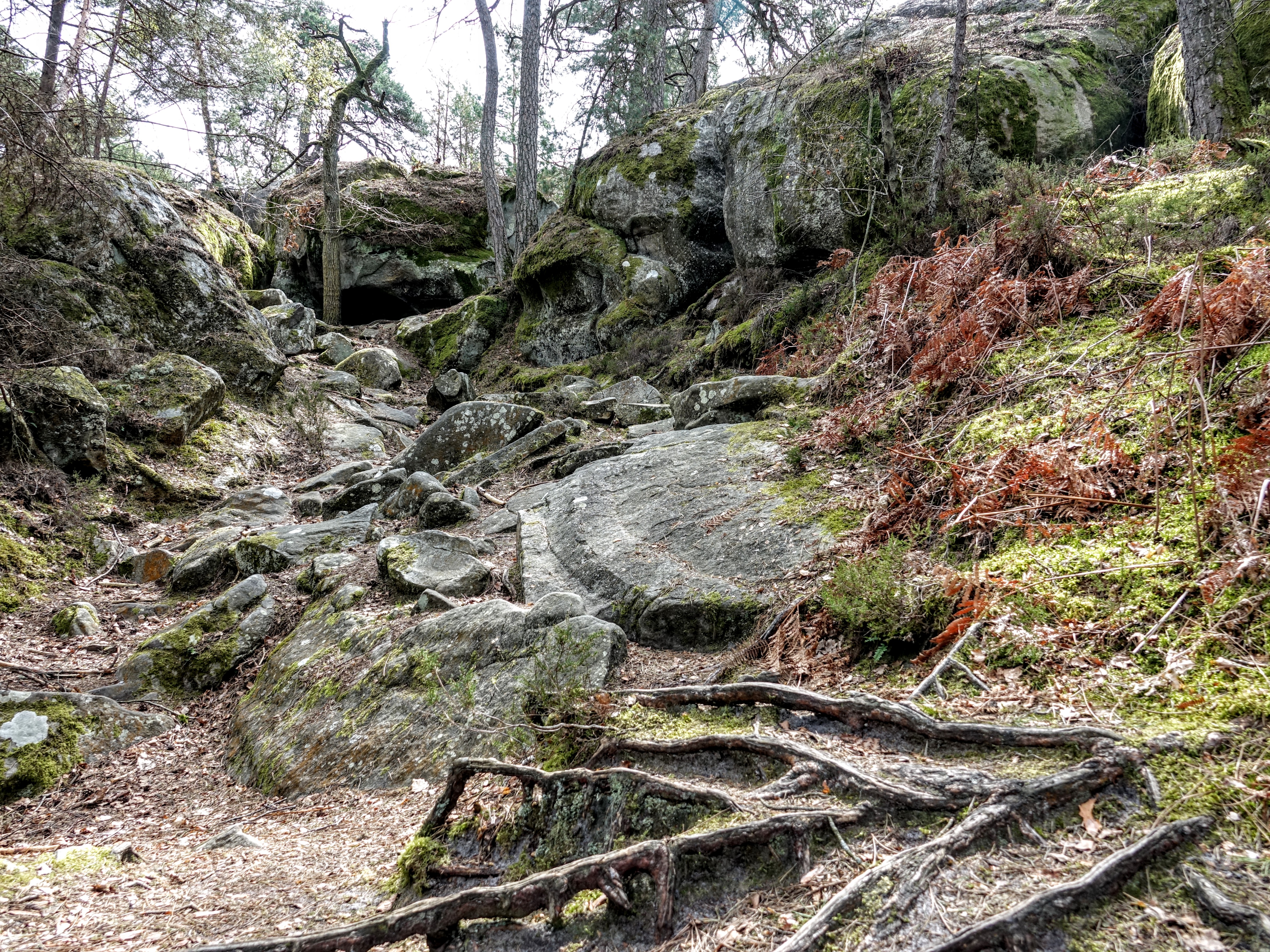 La partie située au Sud-ouest de la forêt de Fontainebleau est la moins fréquentée par les promeneurs. Paradoxalement, c’est peut-être grâce à l’affreuse autoroute A6 qui la sépare du reste du domaine. J’y ai vu des collines pentues et des vallons, des platières désolées, grandes dalles de pierre brisées par le gel et l’eau, et une mer de sable, des rochers d’escalade et des bosses d’entraînement, des landes, des bosquets de bouleaux, quelques châtaigniers et des bouts de forêt méditerranéenne avec des pins et des fougères auxquels ne manquent que le thym et la sarriette.