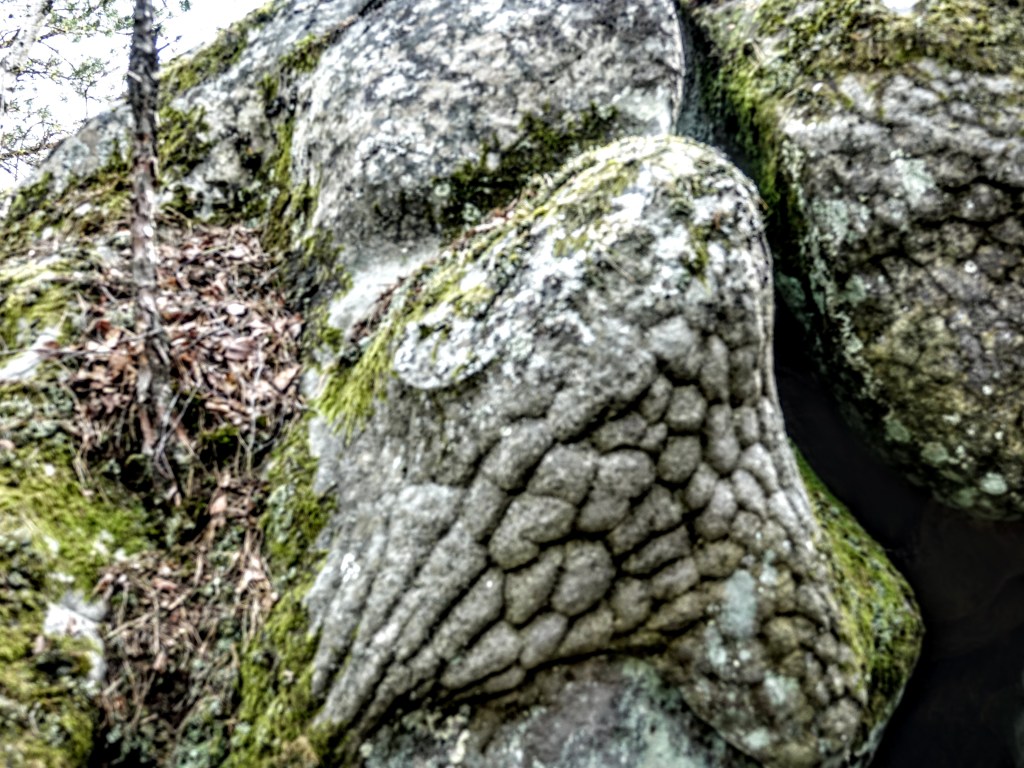 Dans cette forêt, si quadrillée, chaque rocher biscornu a un nom et c’est vrai que des mufles, des carapaces, des gueules se rencontrent partout. Voici une tête aplatie de crocodile avec ses mâchoires puissantes qui avancent :