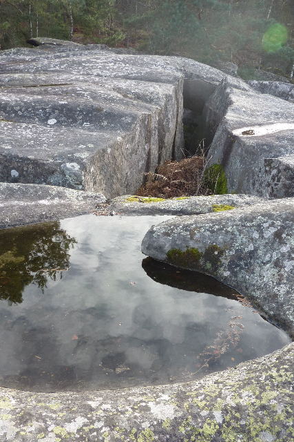 Nous suivons à peu près le sentier Denecourt Colinet n°6 qui fait le tour des Gorges d’Apremont encore peu fréquentées en cette saison. La piste mène le promeneur des platrières pauvres en eau, à part quelques mares très noires, comme la Mare aux Biches et la Mare aux Sangliers…