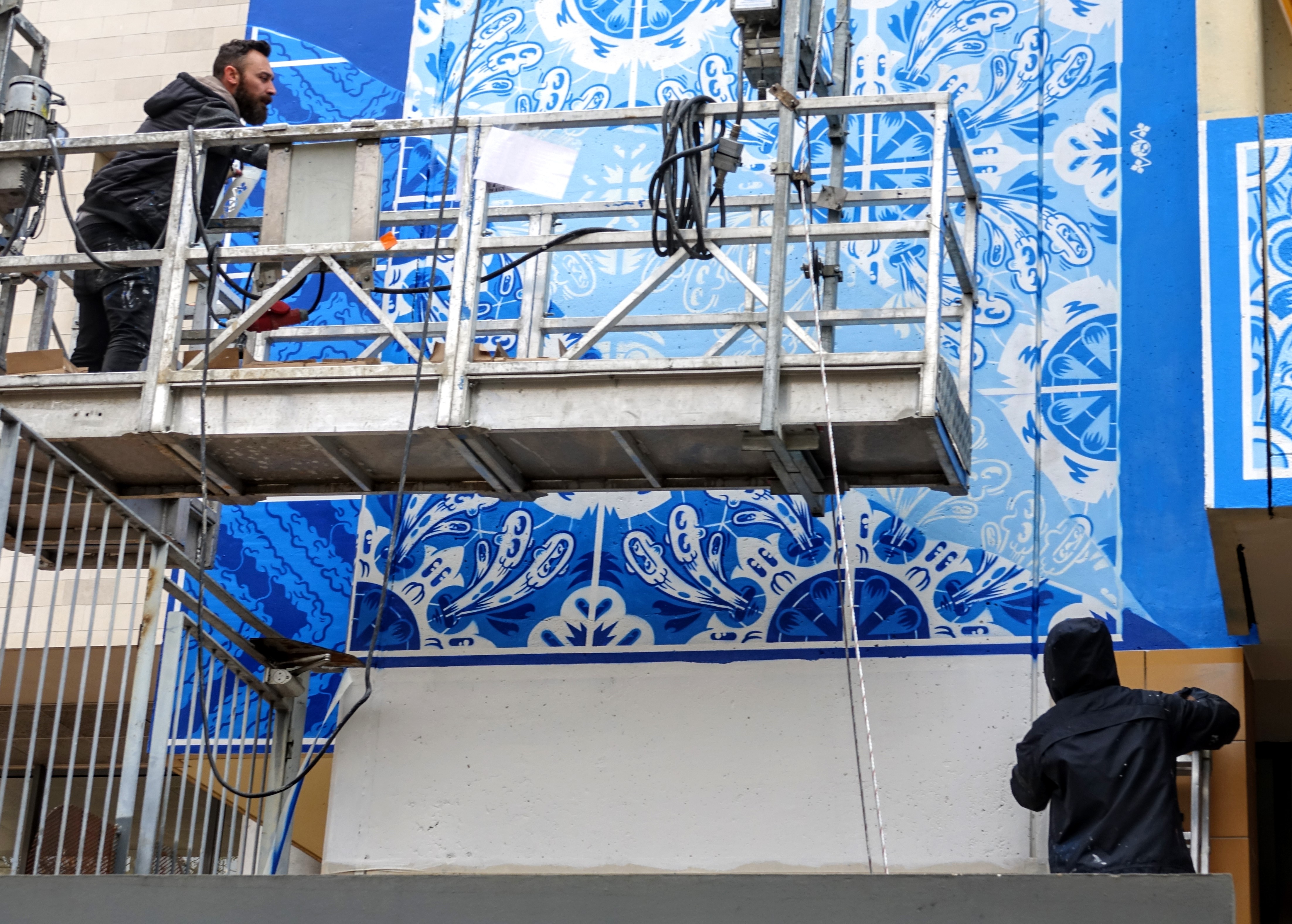 De son vrai nom, Diego Machado, le Portugais, propose une image très différente, calme et décorative, les azulejos de son pays. Il était en train de terminer sa fresque quand nous sommes passés.