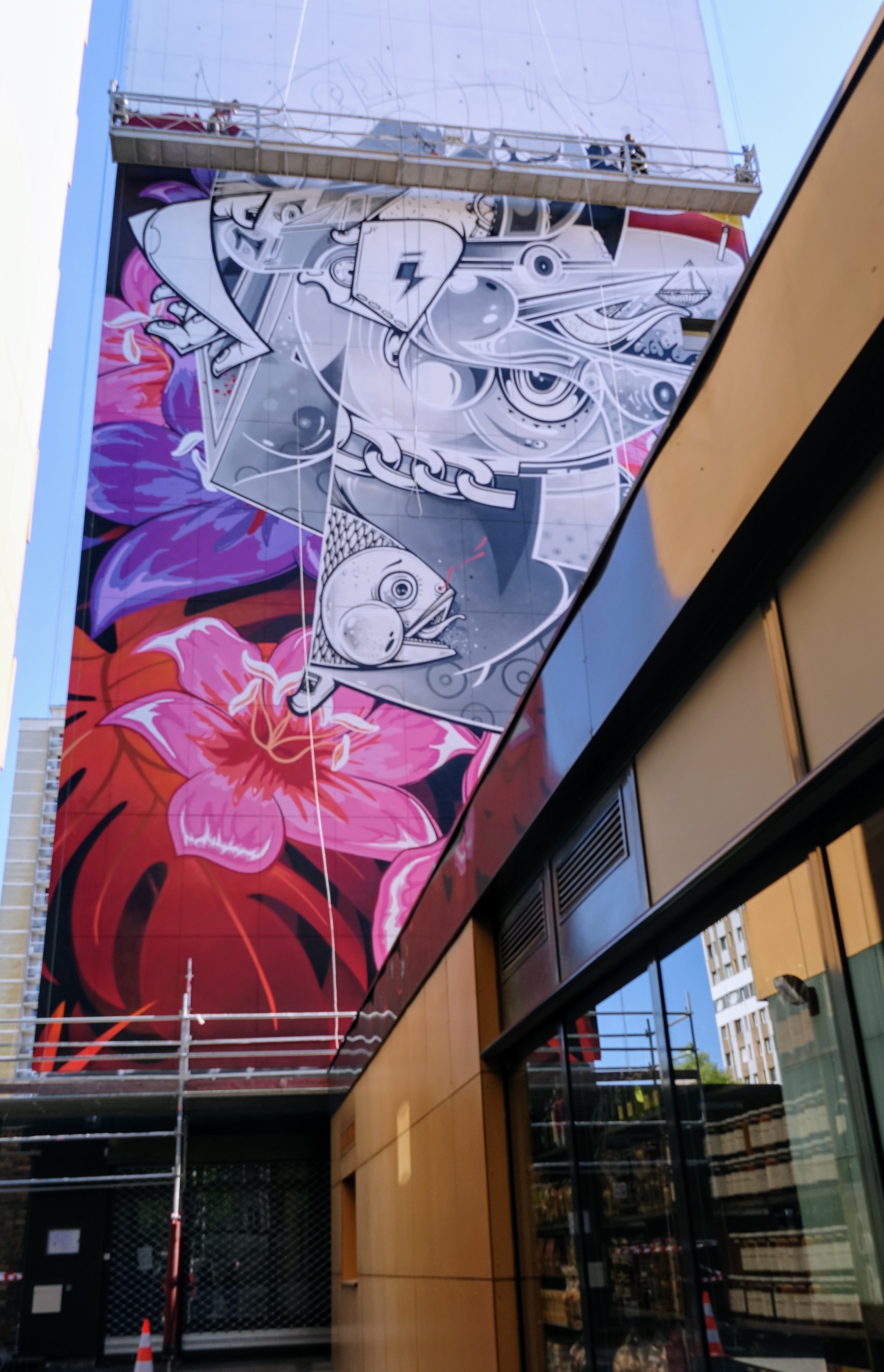 « Redescendez vers la Seine en sortant de la librairie, vous verrez travailler les jumeaux. Ce sont des Basques. Ils s’appellent How et Nosm. Je ne vous en dis pas plus ». Au bas de l’immeuble, les couleurs sont déjà posées ; à mi-pente, le duo travaille sur une nacelle. Poissons et fleurs géantes se détachent. Le reste est encore à deviner.
