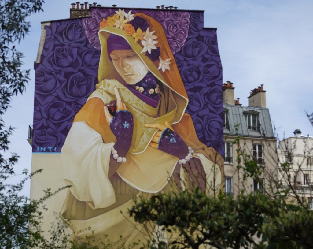Prenons la fresque d’Inti. On perçoit d’abord l’harmonie nouvelle de couleurs, du violet et du jaune, rare dans l’univers pop des arts muraux. C’est une « madone » enveloppée dans son grand vêtement, pâle sur un ciel sombre de roses. Image d’une féminité rassurante qui détourne modestement le regard. Bien différente de la follette de Faile qui saute par-dessus les toits de l’autre côté du boulevard. Lorsqu’on approche sa douceur devient morbide. Pourquoi cette femme tient-elle une pomme étiquetée G (comme Google?) ou bien la pomme rouge est-elle la pomme vénéneuse du conte ? Et pourquoi son collier est-il constitué de têtes de morts ? Qu’a voulu dire le Chilien Inti (soleil en quechua) avec ce nom de Mère laïque, la vierge sécularisée ?